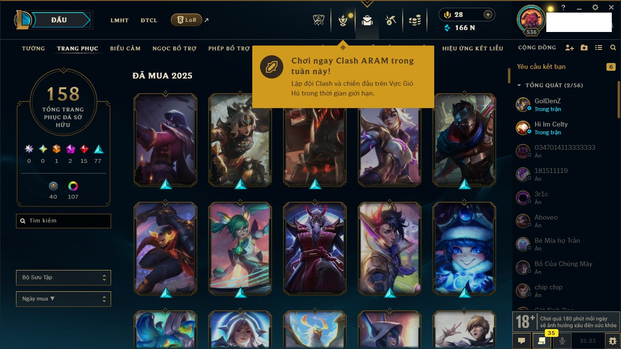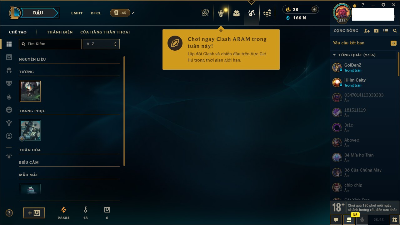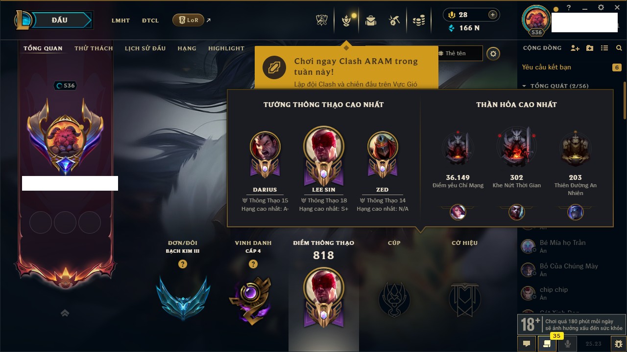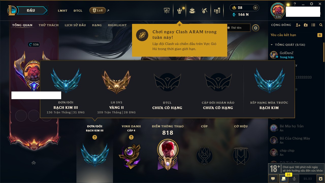 Rank Đơn: Vàng IVKhung: BạcTướng: 166 - Còn 180925 THXTrang Phục: 163Rank ĐTCL: Chưa RankLinh Thú: 67