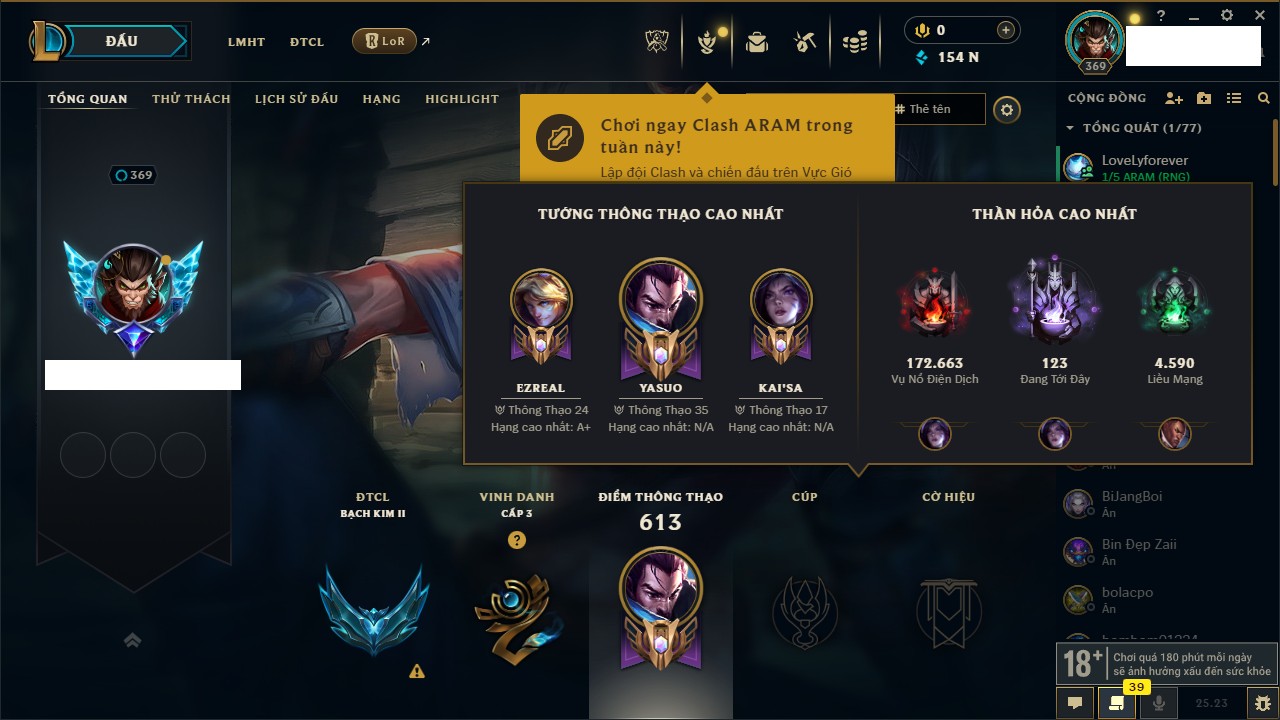 Rank Đơn: Vàng IVKhung: BạcTướng: 166 - Còn 180925 THXTrang Phục: 163Rank ĐTCL: Chưa RankLinh Thú: 67