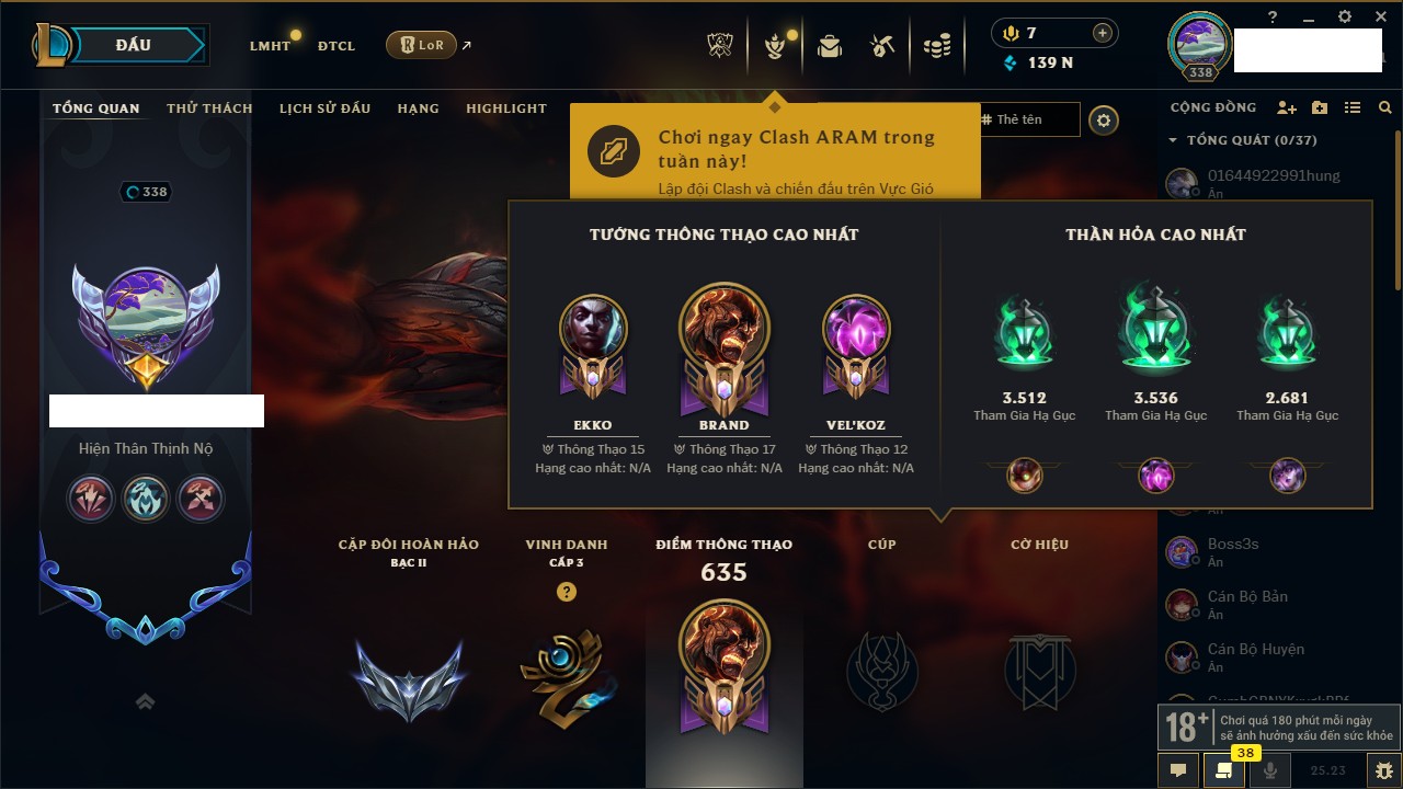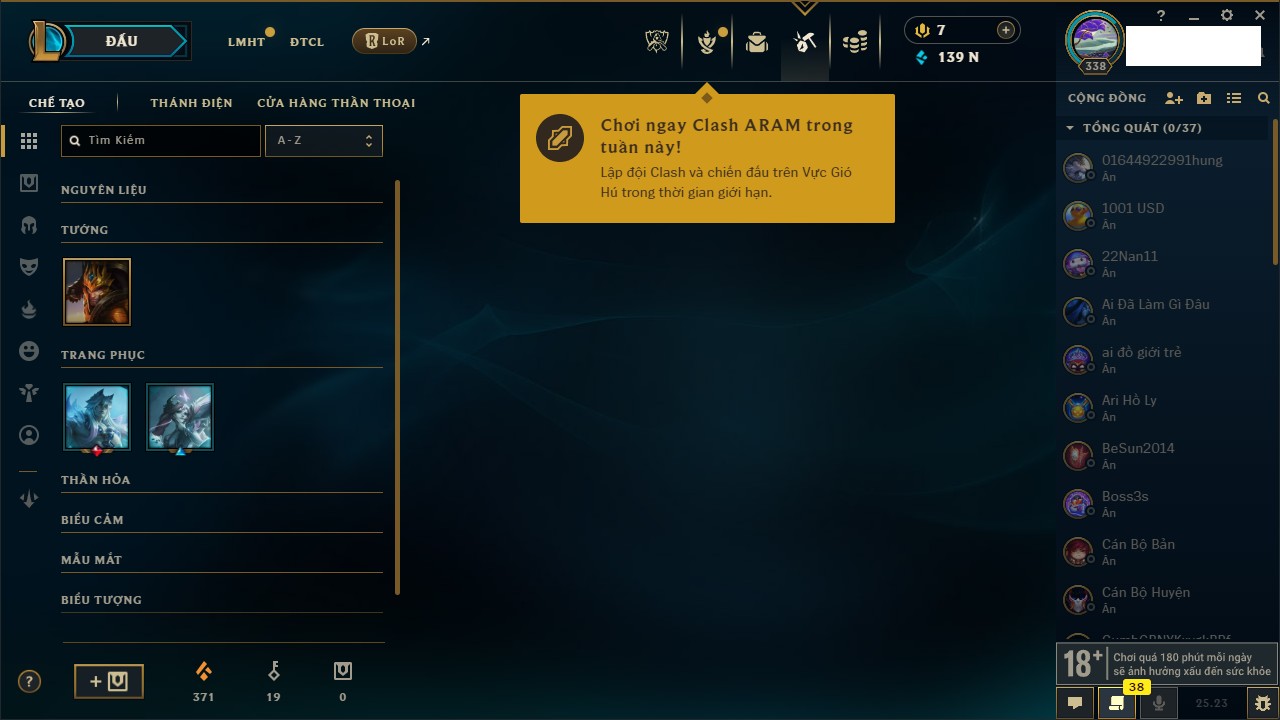 Rank Đơn: Bạch Kim IIIKhung: Bạch kimTướng: 171 - Còn 210697 THXTrang Phục: 220Rank ĐTCL: Bạc IVLinh Thú: 51