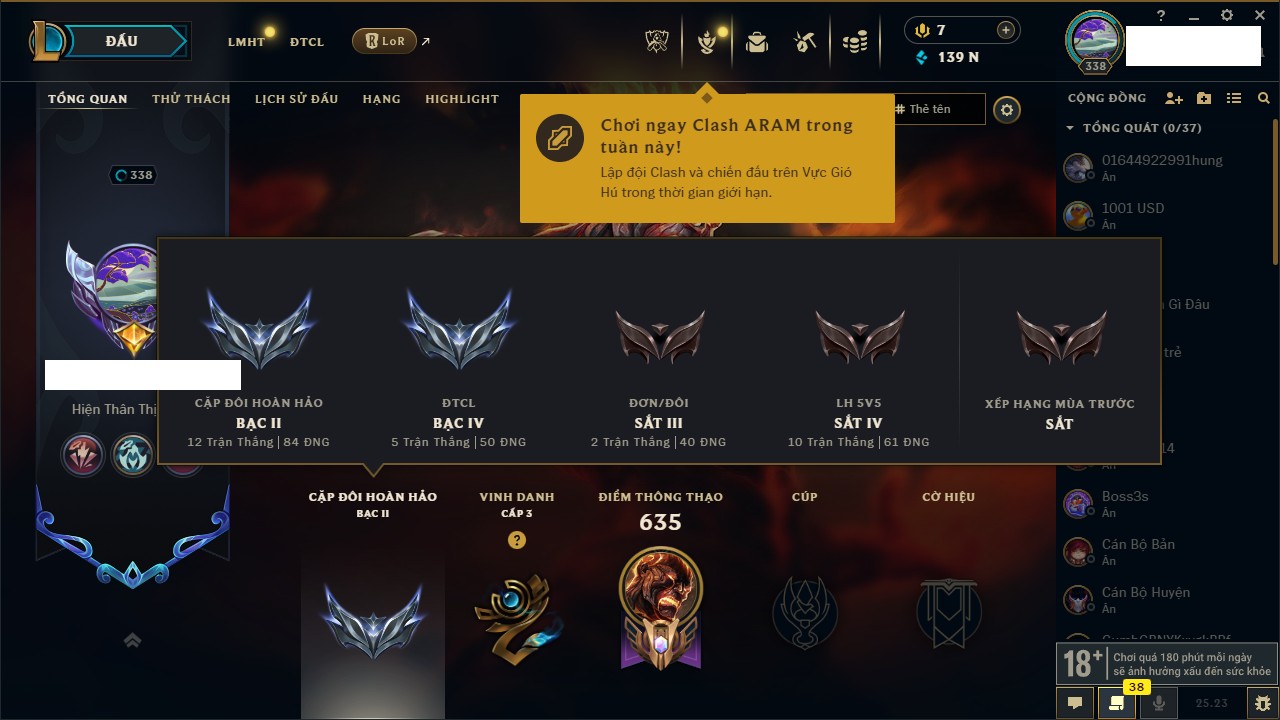 Rank Đơn: Đồng IIKhung: ĐồngTướng: 170 - Còn 6396 THXTrang Phục: 113Rank ĐTCL: Chưa RankLinh Thú: 118