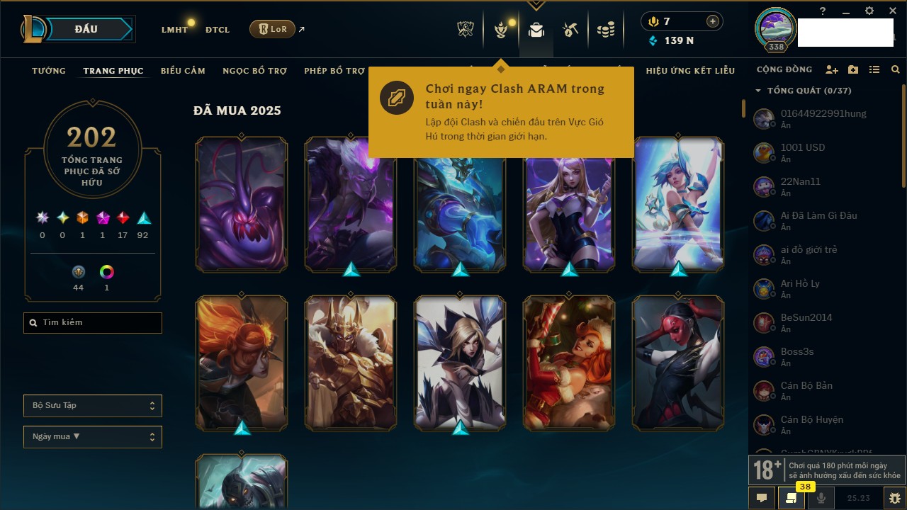Rank Đơn: Chưa RankKhung: Chưa có khungTướng: 167 - Còn 4966 THXTrang Phục: 239Rank ĐTCL: Chưa RankLinh Thú: 52