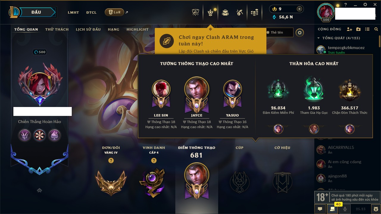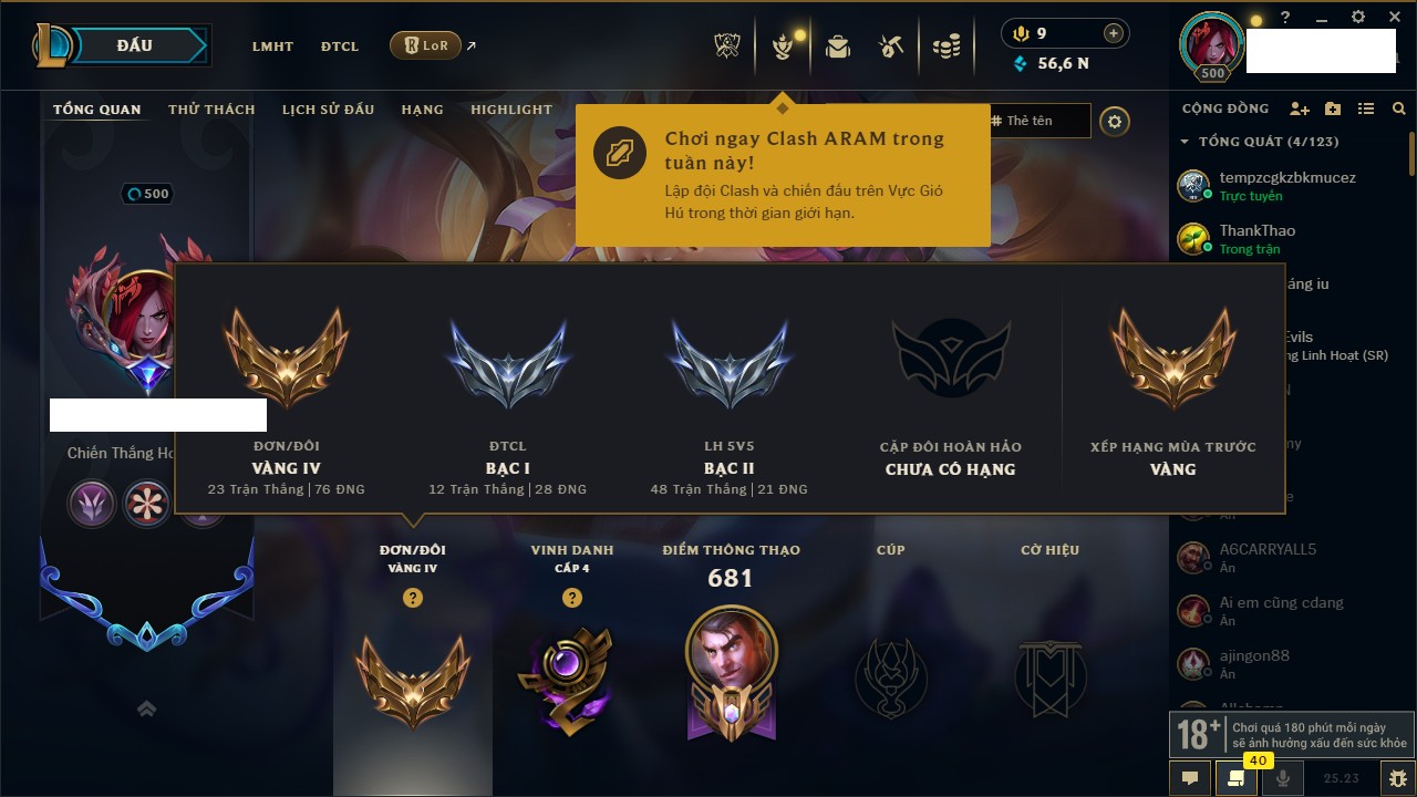 Rank Đơn: Vàng IIIKhung: BạcTướng: 171 - Còn 101359 THXTrang Phục: 88Rank ĐTCL: Kim Cương IVLinh Thú: 200