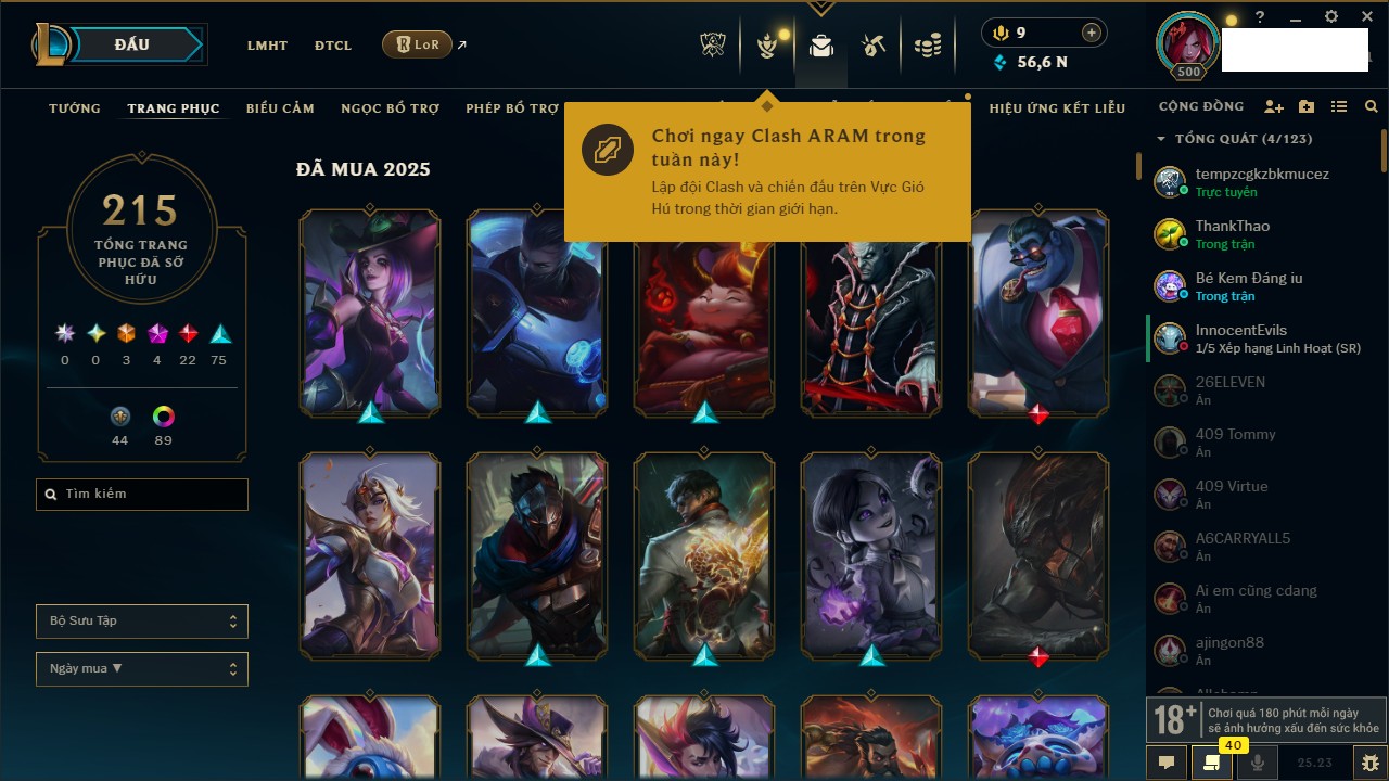 Rank Đơn: Đồng IIKhung: ĐồngTướng: 170 - Còn 66145 THXTrang Phục: 215Rank ĐTCL: Chưa RankLinh Thú: 52