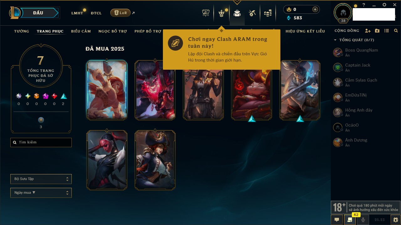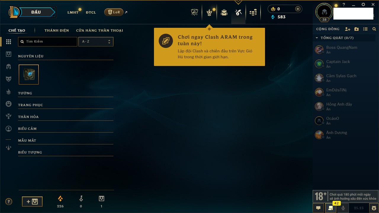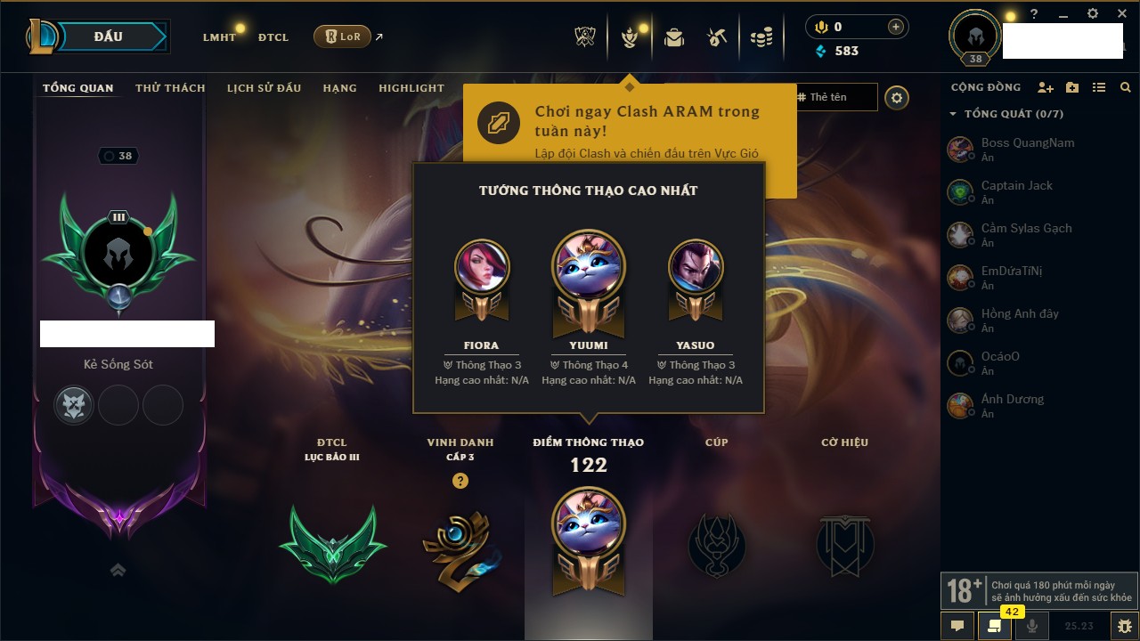 Rank Đơn: Vàng IVKhung: BạcTướng: 171 - Còn 426239 THXTrang Phục: 162Rank ĐTCL: Chưa RankLinh Thú: 33