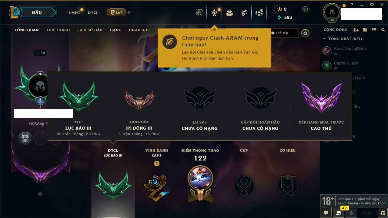 Rank Đơn: Bạc IIKhung: VàngTướng: 171 - Còn 332462 THXTrang Phục: 165Rank ĐTCL: Kim Cương IVLinh Thú: 181