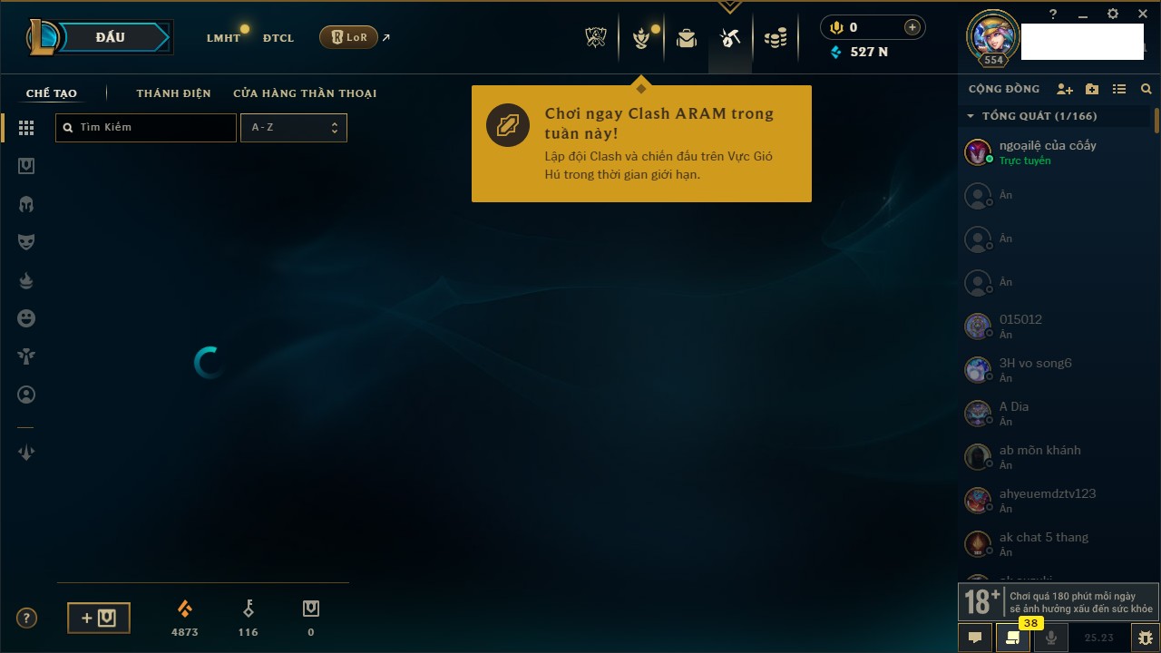 Rank Đơn: Vàng IVKhung: VàngTướng: 171 - Còn 660284 THXTrang Phục: 199Rank ĐTCL: Chưa RankLinh Thú: 34