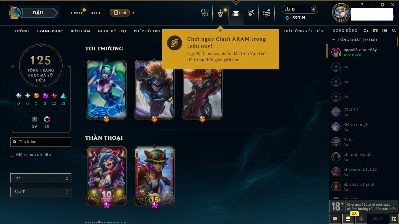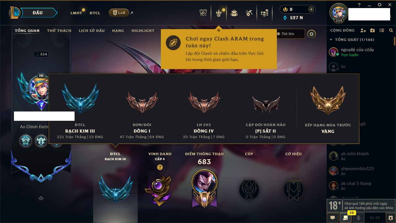 Rank Đơn: Vàng IIIKhung: VàngTướng: 171 - Còn 88128 THXTrang Phục: 329Rank ĐTCL: Chưa RankLinh Thú: 41