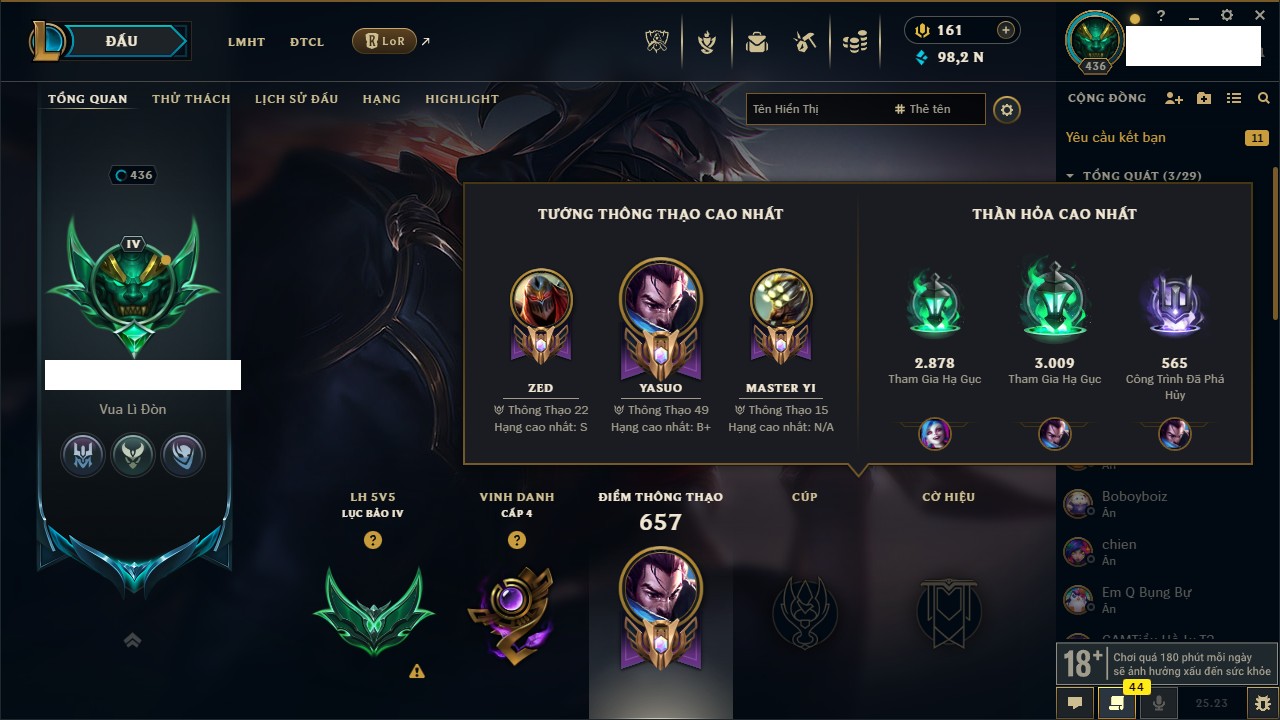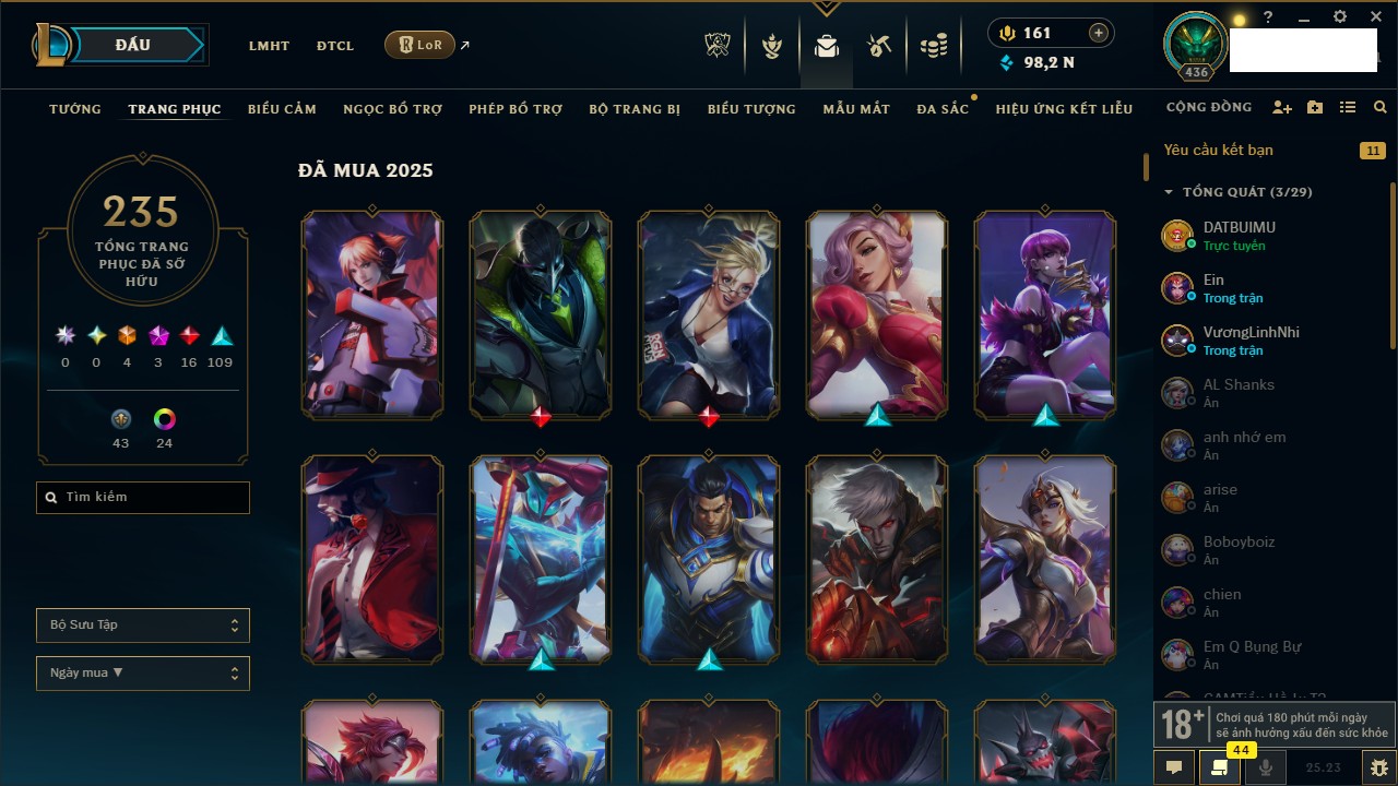 Rank Đơn: Vàng IIKhung: VàngTướng: 171 - Còn 219803 THXTrang Phục: 254Rank ĐTCL: Chưa RankLinh Thú: 78