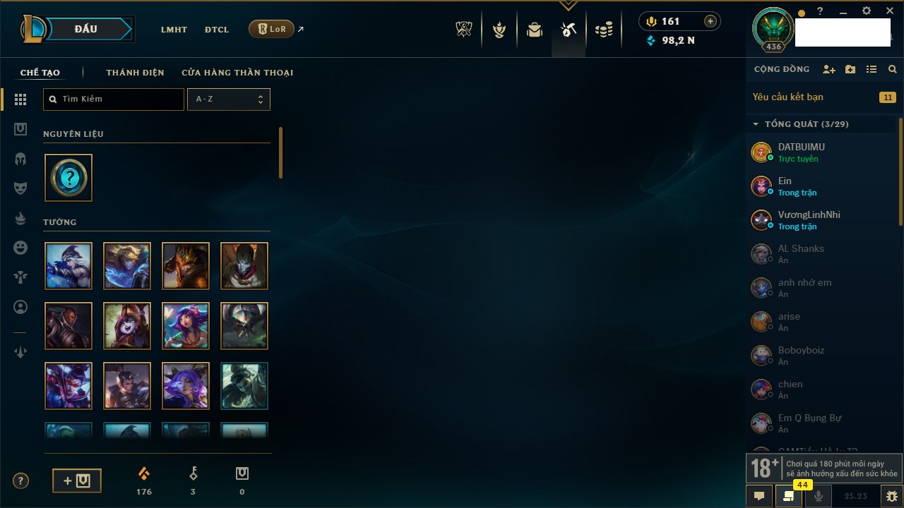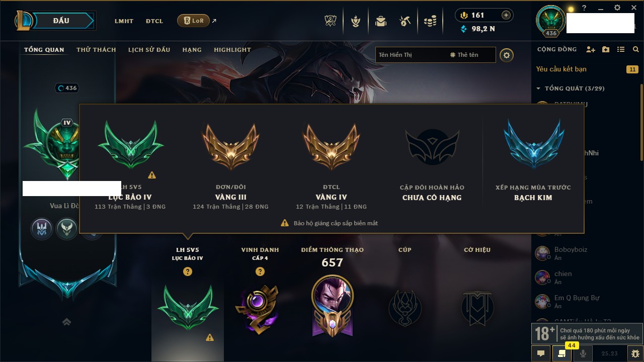 Rank Đơn: Bạch Kim IVKhung: VàngTướng: 171 - Còn 130280 THXTrang Phục: 226Rank ĐTCL: Kim Cương IVLinh Thú: 183