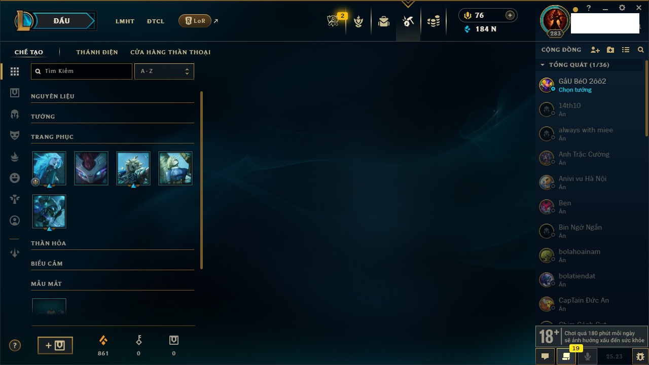 Rank Đơn: Bạch Kim IVKhung: VàngTướng: 170 - Còn 34137 THXTrang Phục: 209Rank ĐTCL: Chưa RankLinh Thú: 108