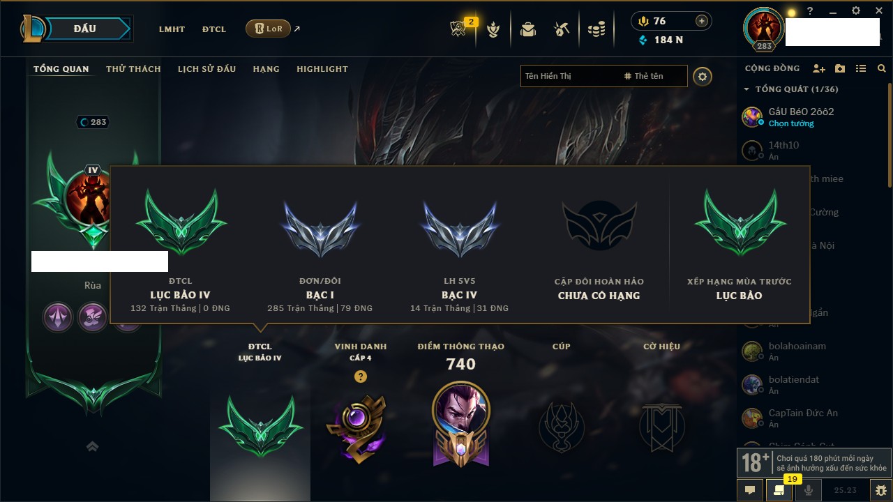 Rank Đơn: Vàng IIKhung: Bạch kimTướng: 172 - Còn 123420 THXTrang Phục: 231Rank ĐTCL: Bạch Kim IVLinh Thú: 213