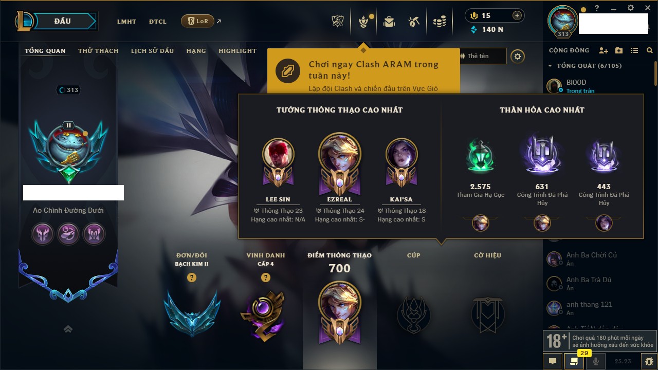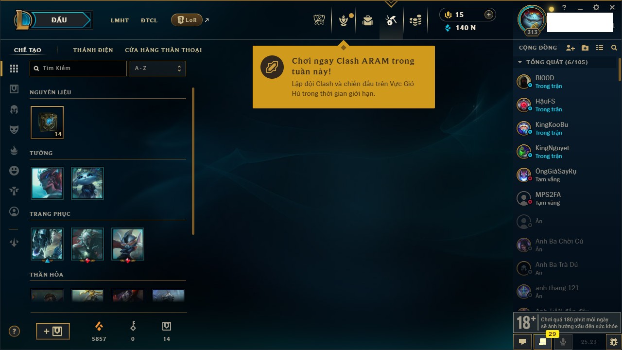 Rank Đơn: Bạch Kim IIKhung: VàngTướng: 171 - Còn 140736 THXTrang Phục: 182Rank ĐTCL: Chưa RankLinh Thú: 14