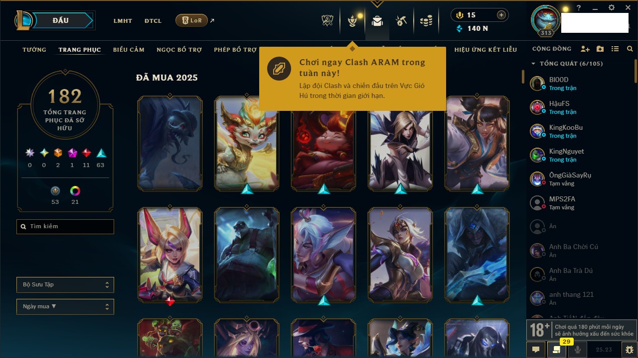 Rank Đơn: Vàng IKhung: VàngTướng: 171 - Còn 117995 THXTrang Phục: 199Rank ĐTCL: Lục Bảo IILinh Thú: 74