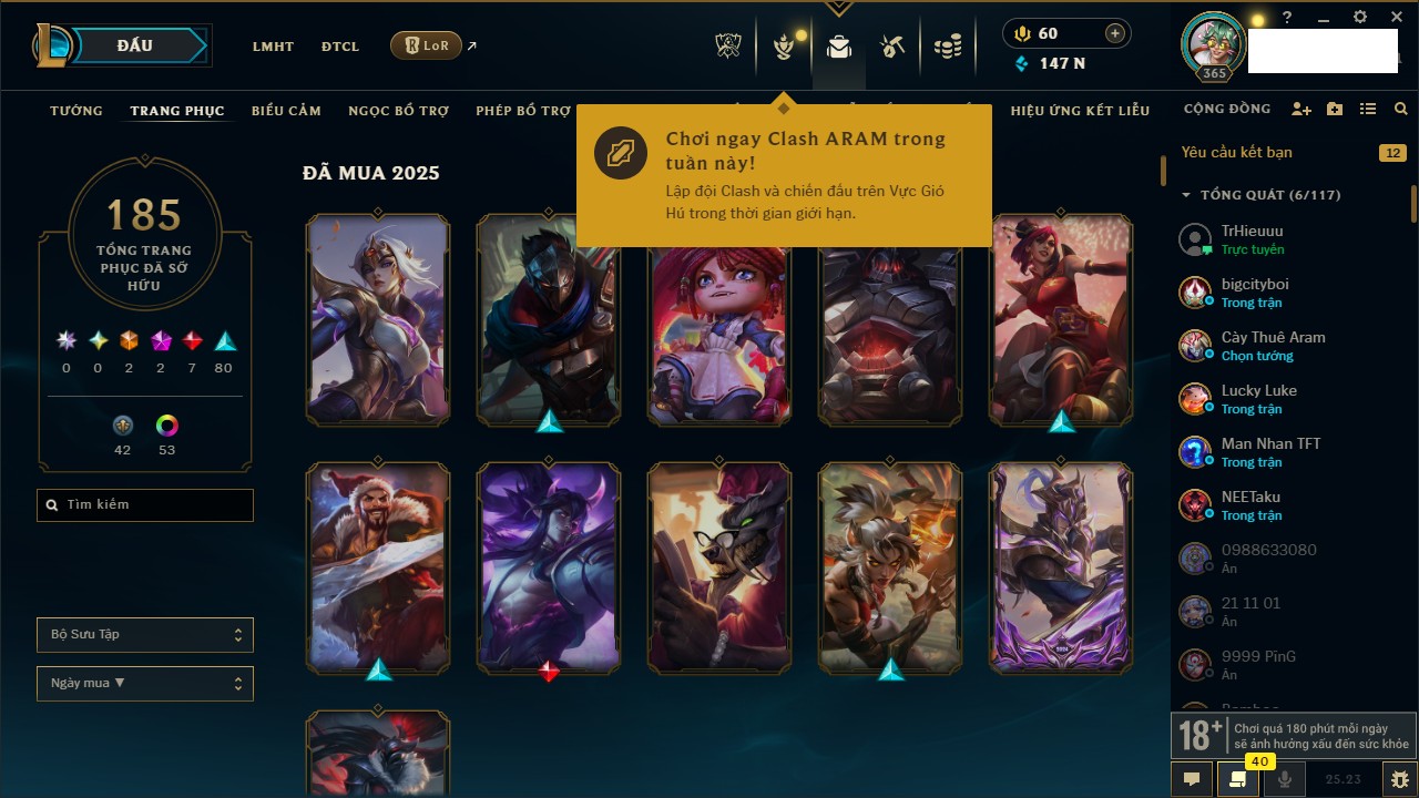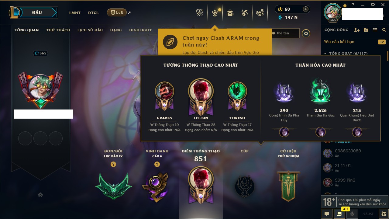 Rank Đơn: Đồng IKhung: ĐồngTướng: 168 - Còn 11447 THXTrang Phục: 245Rank ĐTCL: Chưa RankLinh Thú: 53
