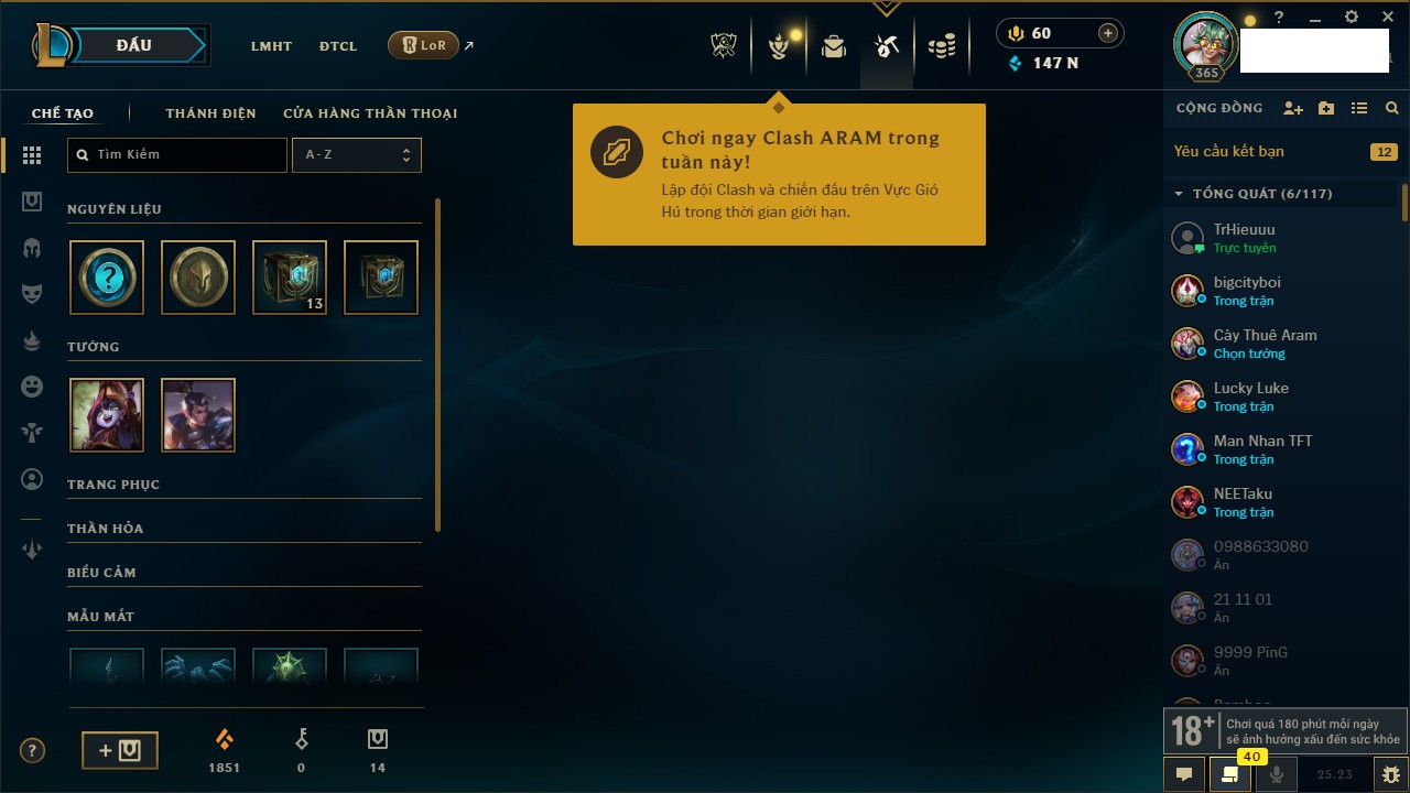 Rank Đơn: Vàng IIIKhung: BạcTướng: 171 - Còn 101359 THXTrang Phục: 88Rank ĐTCL: Kim Cương IVLinh Thú: 200