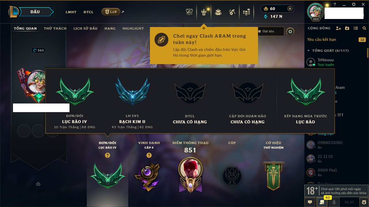 Rank Đơn: Lục Bảo IVKhung: Bạch kimTướng: 171 - Còn 128452 THXTrang Phục: 193Rank ĐTCL: Bạc IIILinh Thú: 100