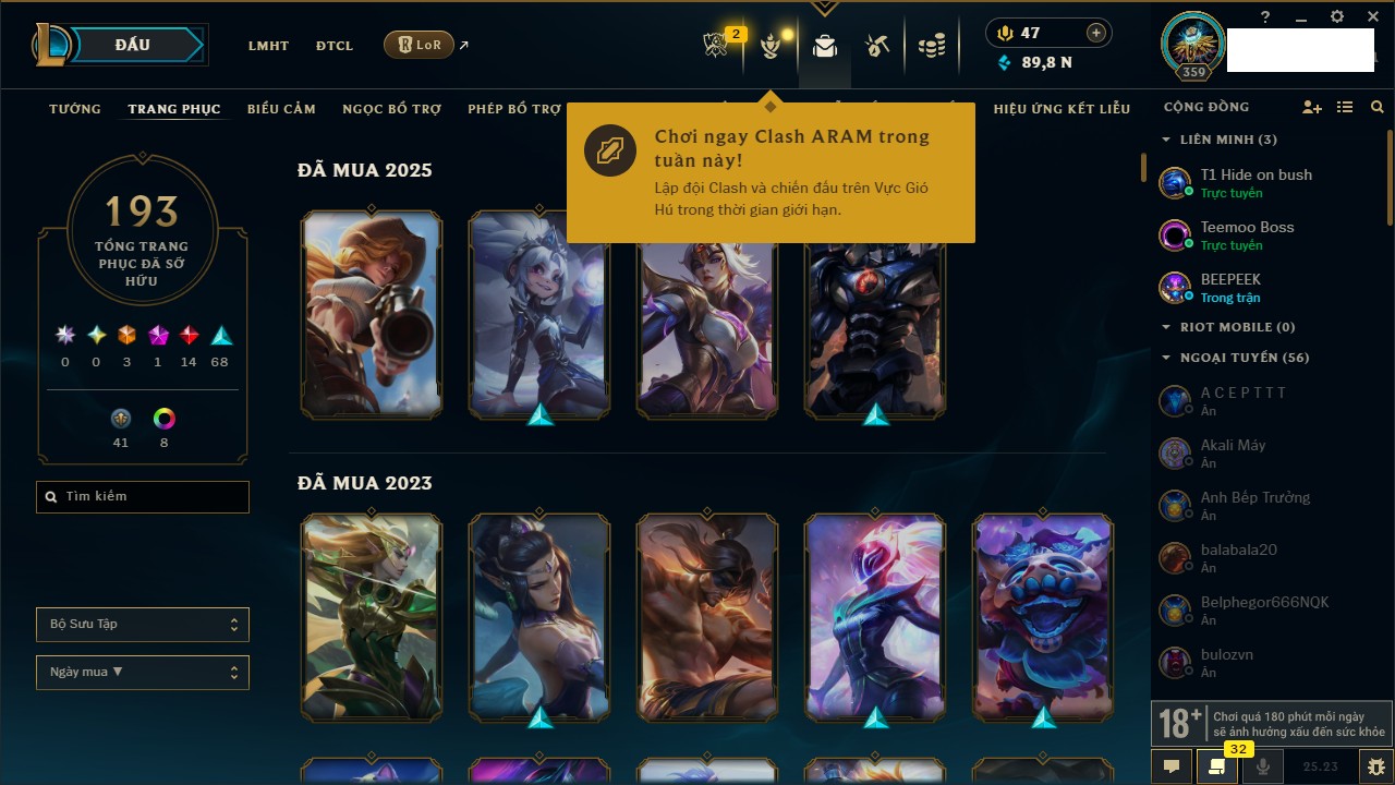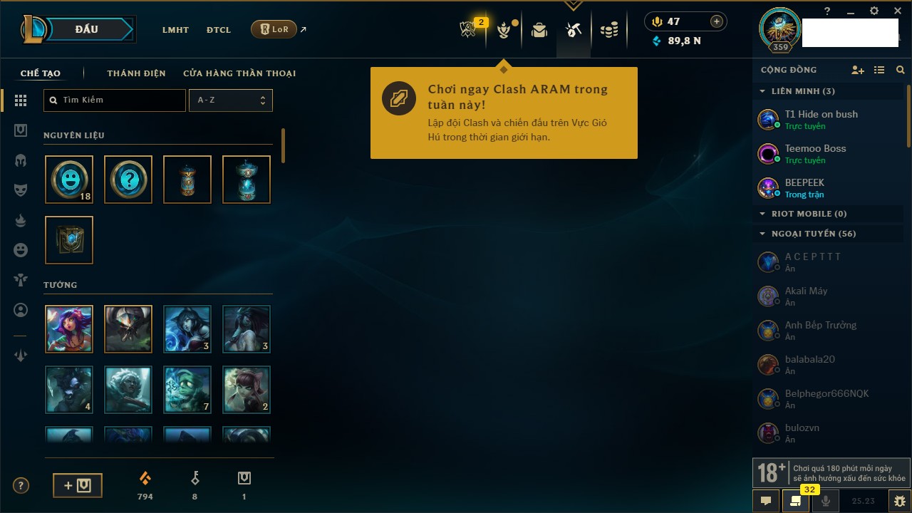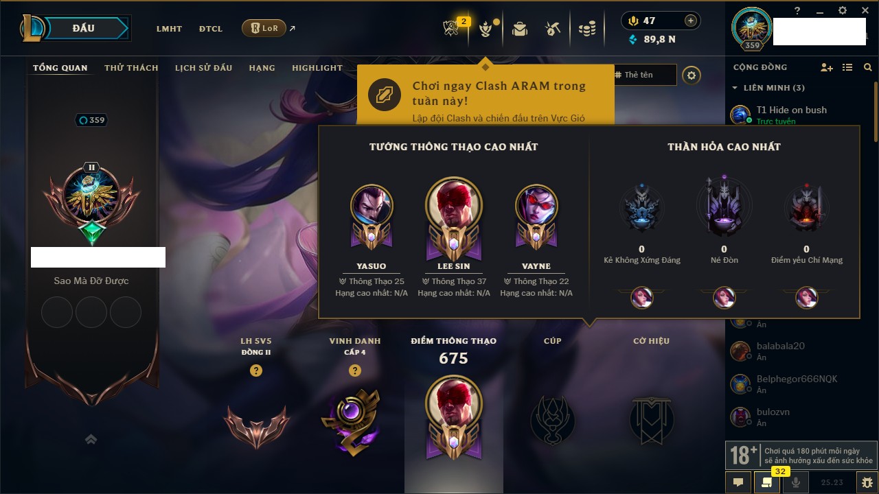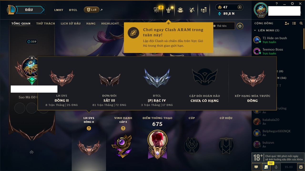 Rank Đơn: Bạc IIIKhung: BạcTướng: 171 - Còn 51045 THXTrang Phục: 220Rank ĐTCL: Sắt IILinh Thú: 141