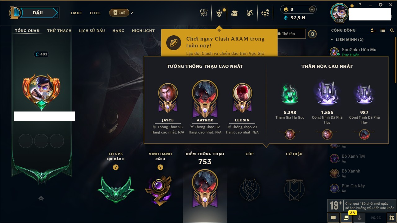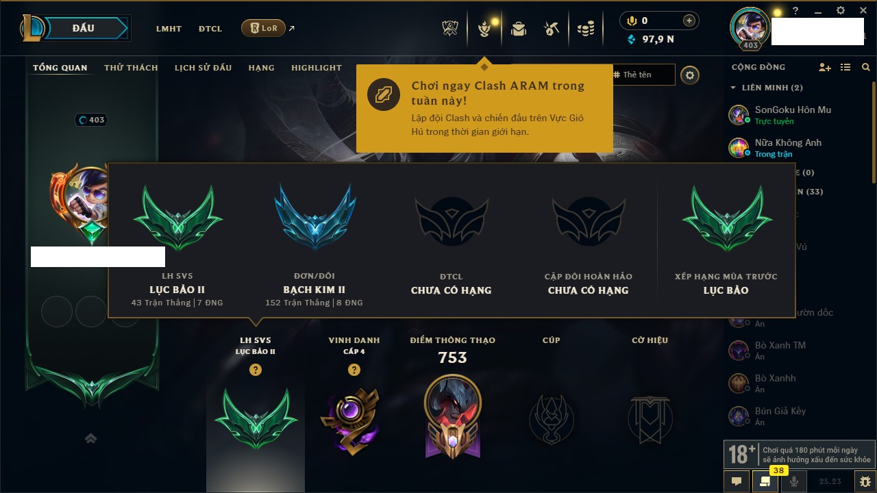 Rank Đơn: Lục Bảo IVKhung: VàngTướng: 171 - Còn 154648 THXTrang Phục: 203Rank ĐTCL: Bạch Kim IVLinh Thú: 69