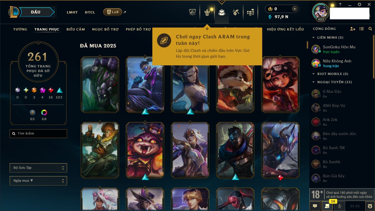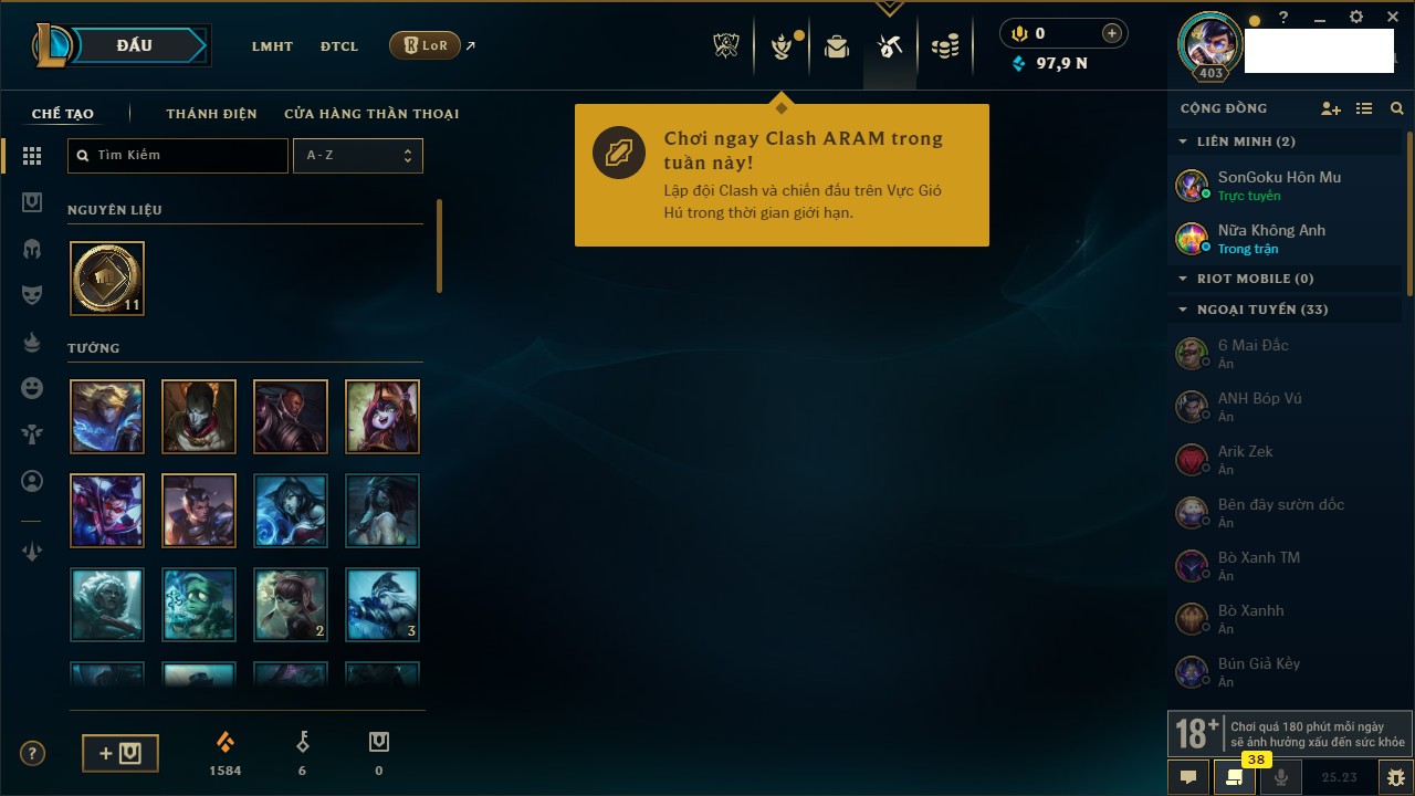 Rank Đơn: Vàng IIIKhung: VàngTướng: 172 - Còn 164704 THXTrang Phục: 255Rank ĐTCL: Kim Cương IVLinh Thú: 156