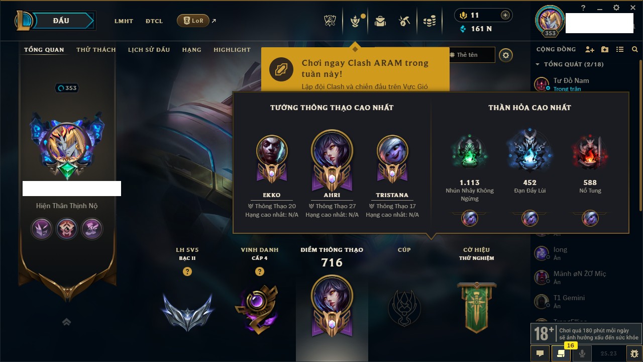 Rank Đơn: Bạc IIIKhung: VàngTướng: 171 - Còn 386278 THXTrang Phục: 170Rank ĐTCL: Chưa RankLinh Thú: 30