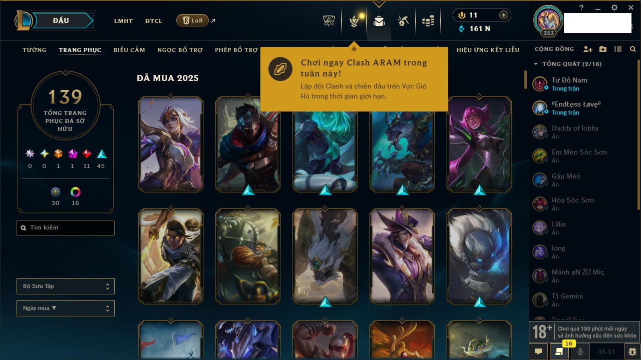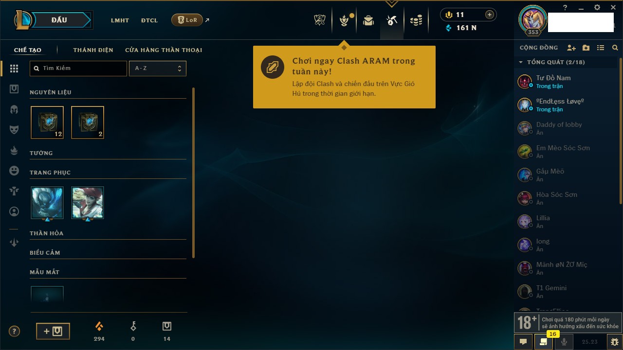 Rank Đơn: Bạc IVKhung: BạcTướng: 171 - Còn 102637 THXTrang Phục: 169Rank ĐTCL: Vàng IILinh Thú: 127