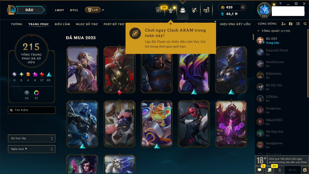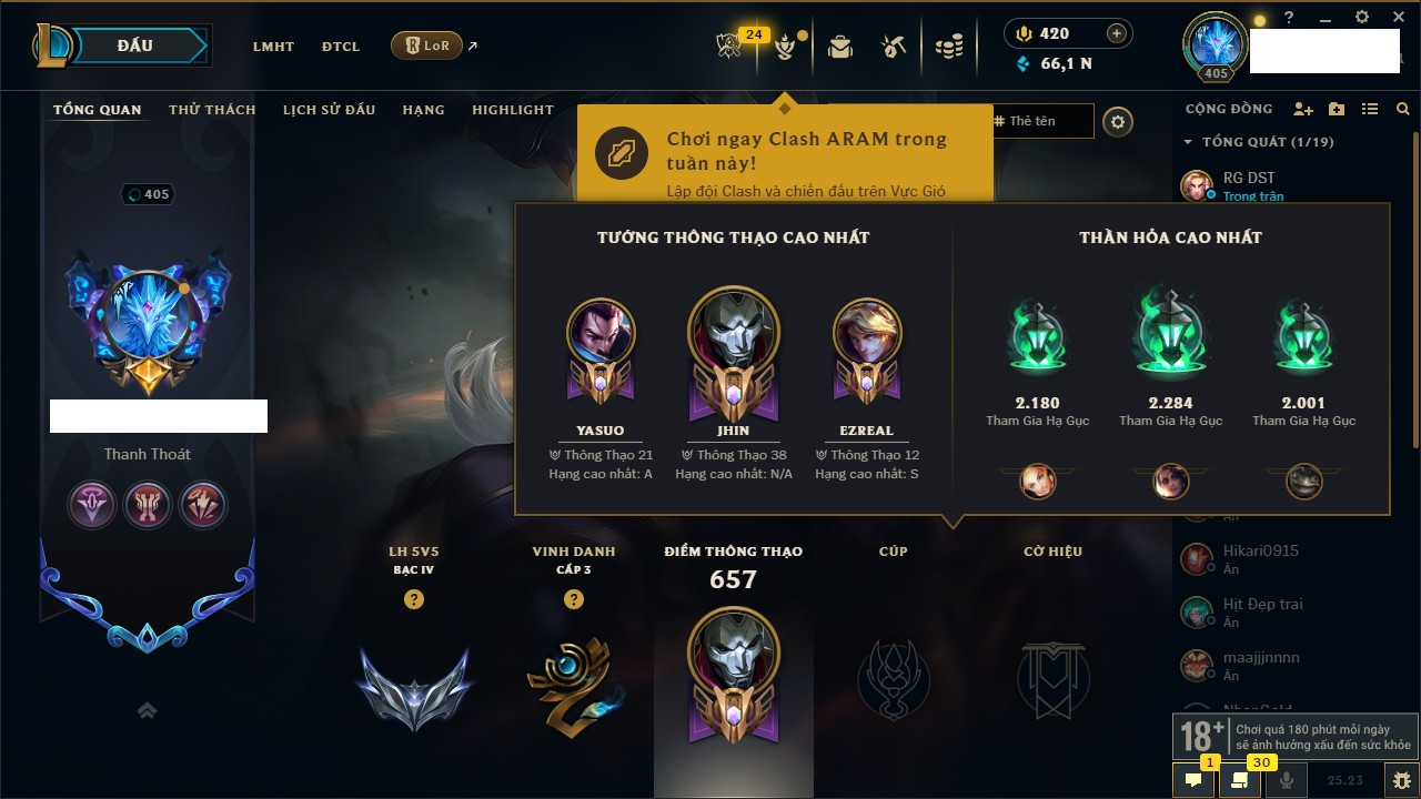 Rank Đơn: Vàng IIIKhung: BạcTướng: 171 - Còn 101359 THXTrang Phục: 88Rank ĐTCL: Kim Cương IVLinh Thú: 200