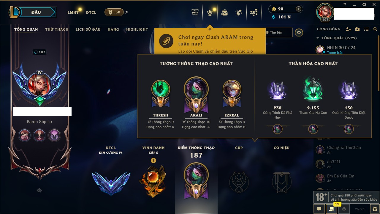 Rank Đơn: Đồng IKhung: ĐồngTướng: 168 - Còn 11447 THXTrang Phục: 245Rank ĐTCL: Chưa RankLinh Thú: 53