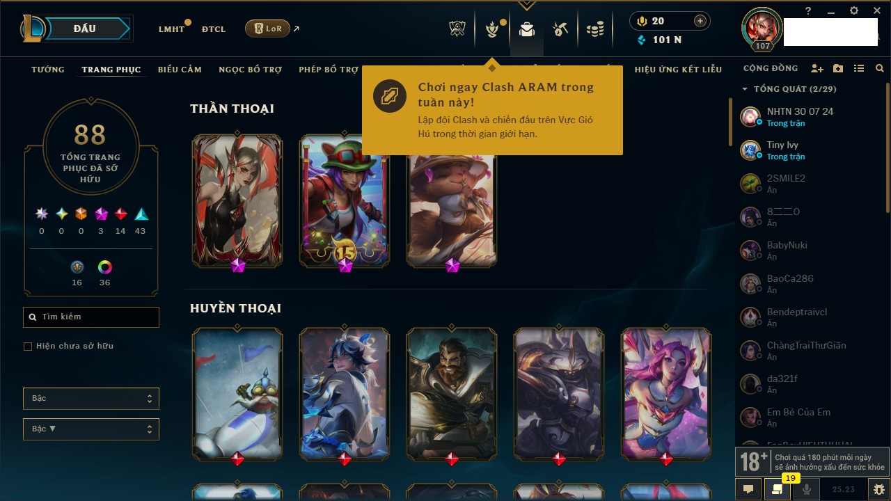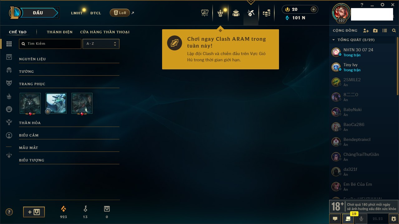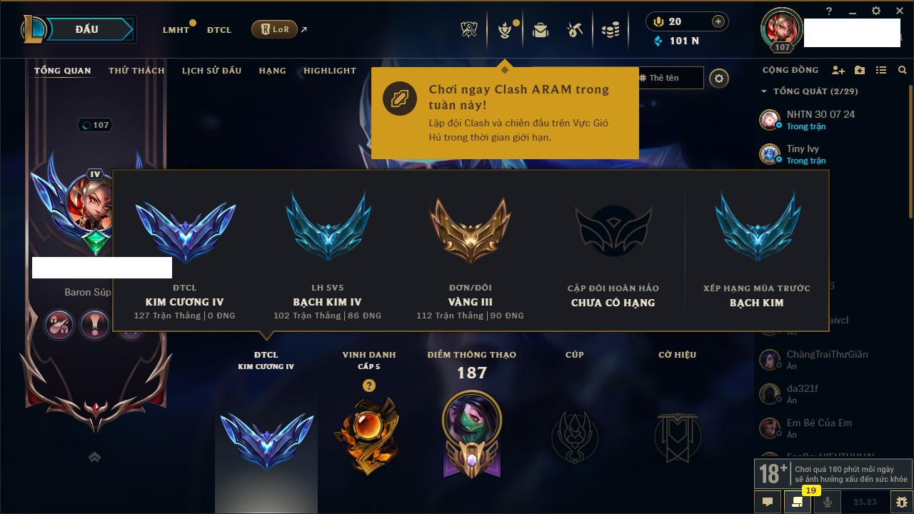Rank Đơn: Vàng IIIKhung: BạcTướng: 171 - Còn 101359 THXTrang Phục: 88Rank ĐTCL: Kim Cương IVLinh Thú: 200
