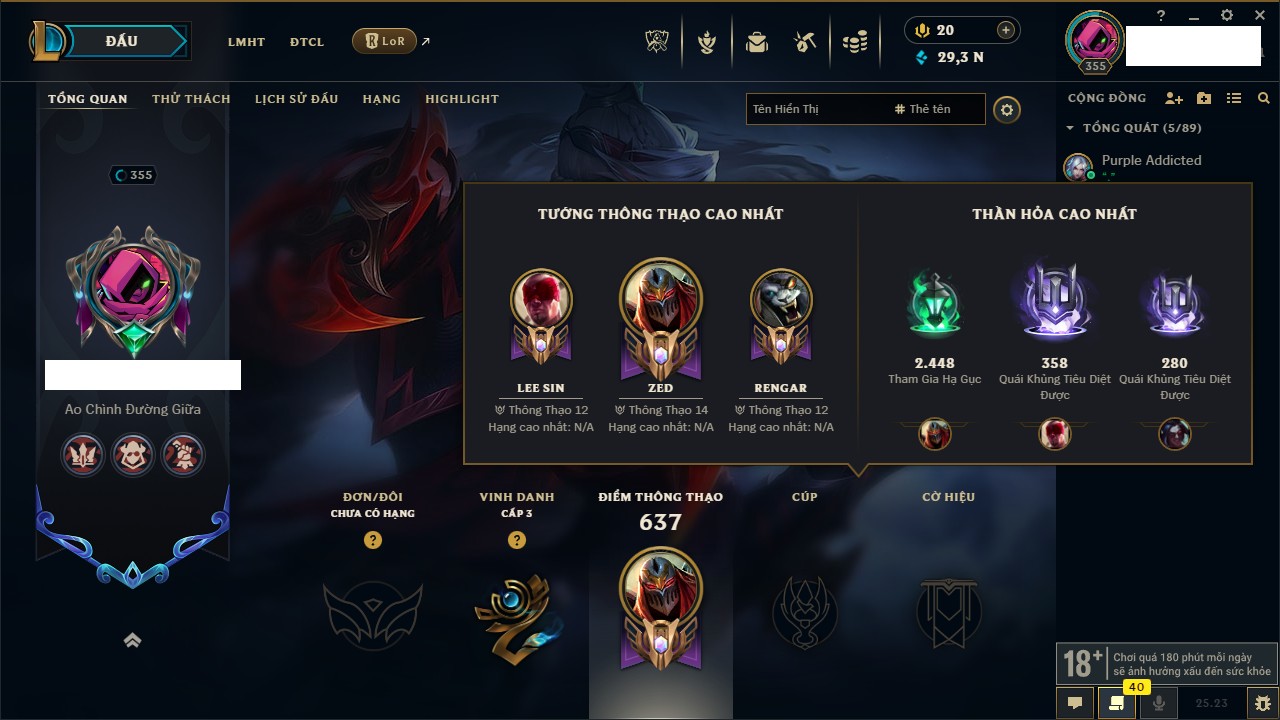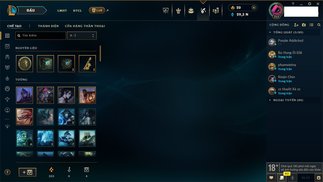 Rank Đơn: Bạch Kim IIIKhung: Bạch kimTướng: 171 - Còn 251383 THXTrang Phục: 229Rank ĐTCL: Sắt IILinh Thú: 51