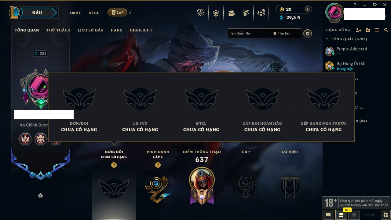Rank Đơn: Vàng IKhung: BạcTướng: 171 - Còn 60584 THXTrang Phục: 286Rank ĐTCL: Vàng IIILinh Thú: 117