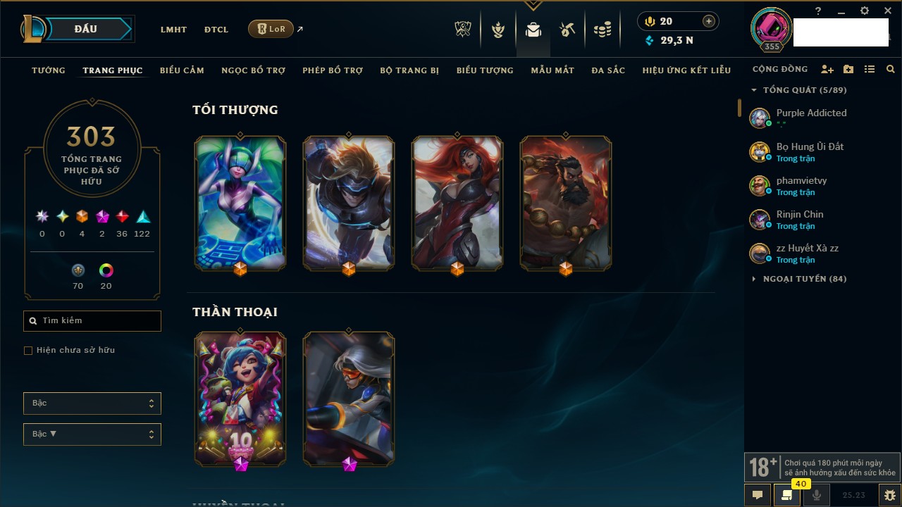 Rank Đơn: Vàng IIIKhung: VàngTướng: 171 - Còn 88128 THXTrang Phục: 329Rank ĐTCL: Chưa RankLinh Thú: 41