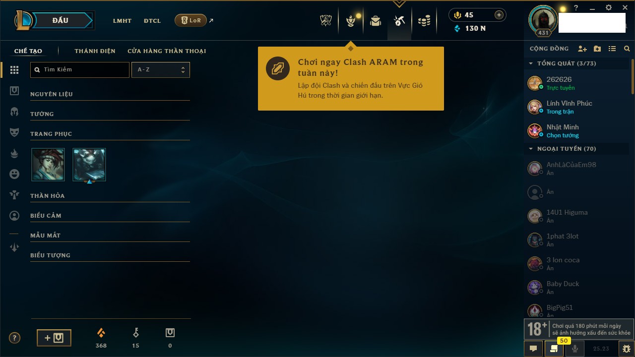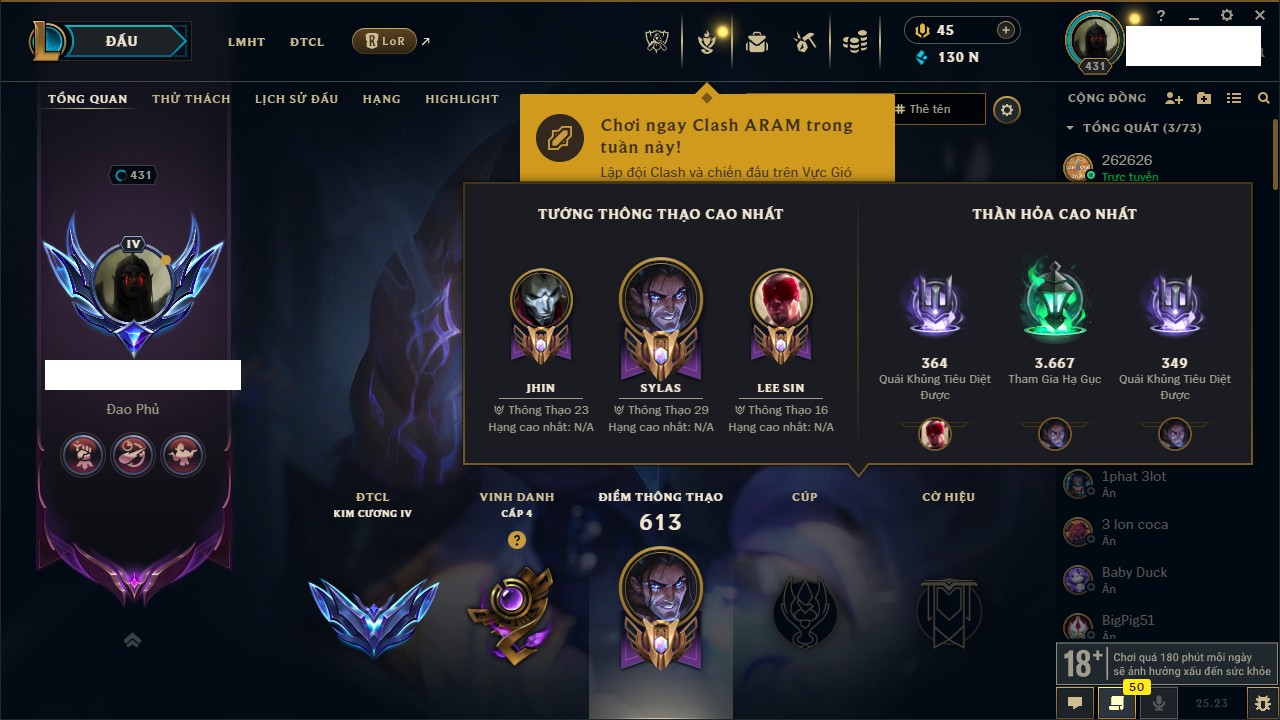 Rank Đơn: Bạch Kim IVKhung: VàngTướng: 171 - Còn 130578 THXTrang Phục: 253Rank ĐTCL: Chưa RankLinh Thú: 20