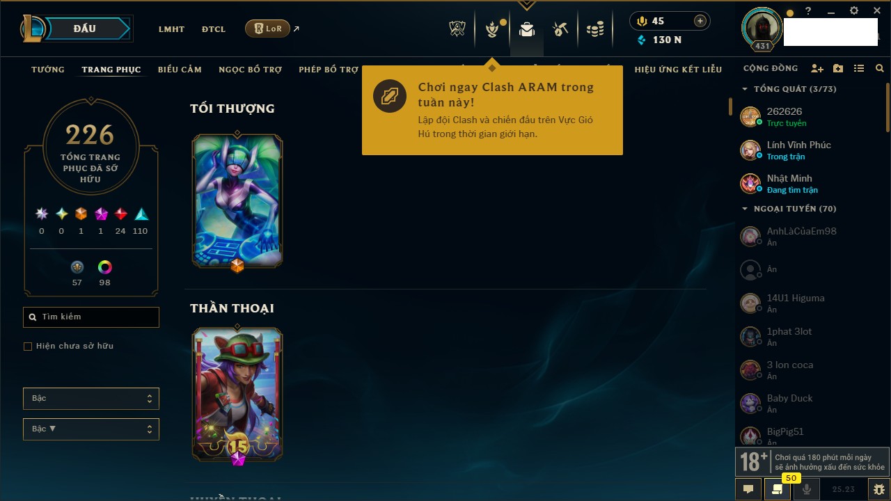 Rank Đơn: Vàng IIKhung: VàngTướng: 171 - Còn 219803 THXTrang Phục: 254Rank ĐTCL: Chưa RankLinh Thú: 78