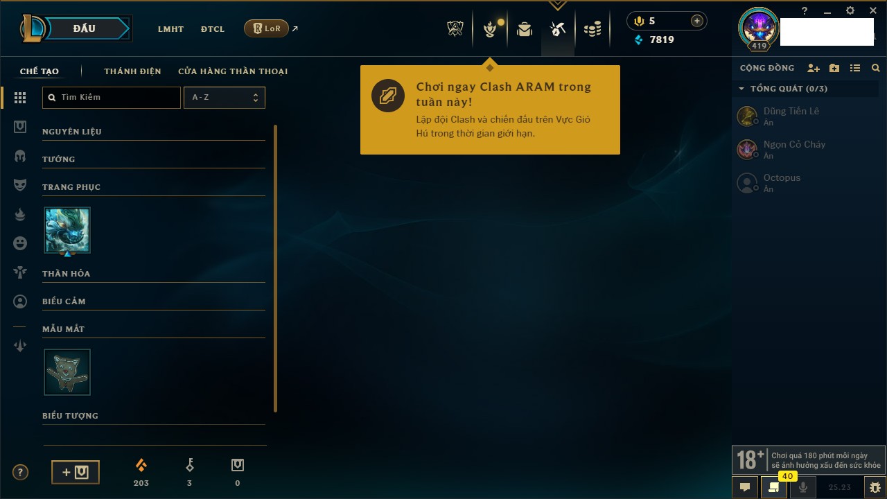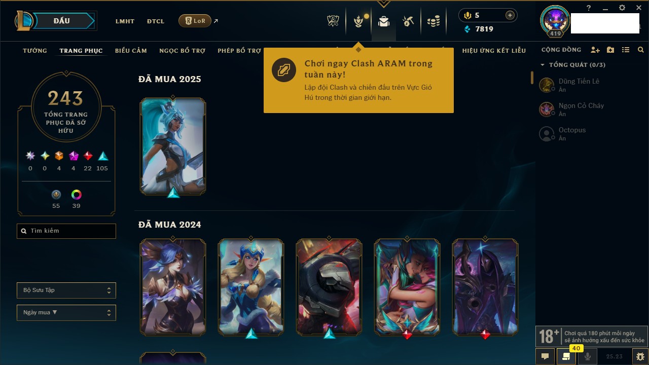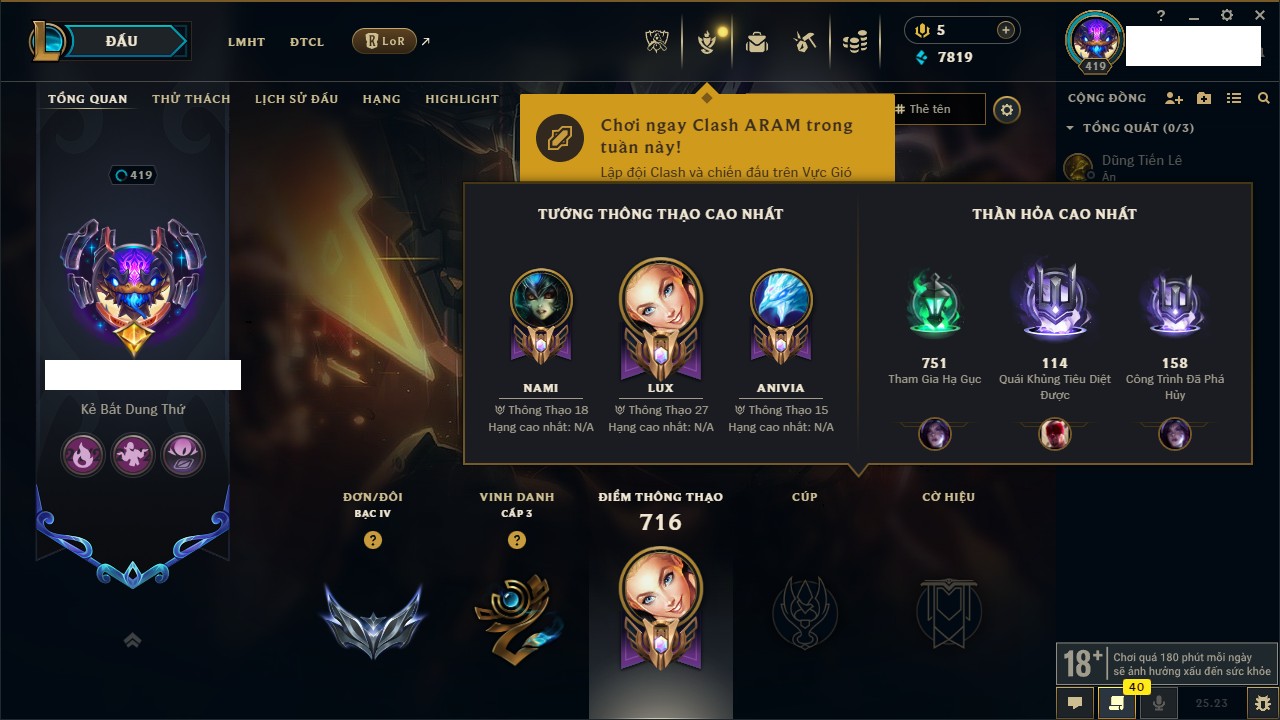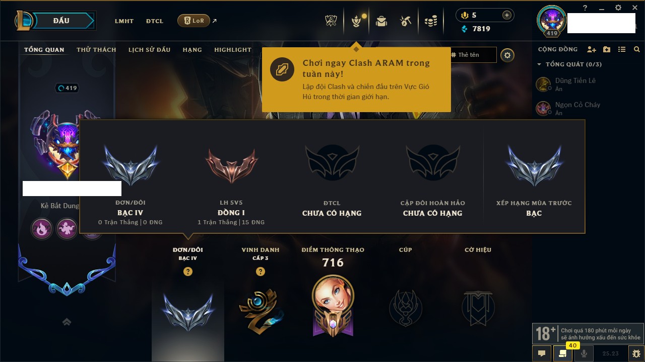 Rank Đơn: Bạc IVKhung: BạcTướng: 171 - Còn 7819 THXTrang Phục: 243Rank ĐTCL: Chưa RankLinh Thú: 102