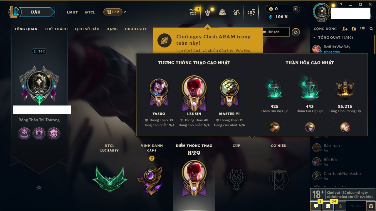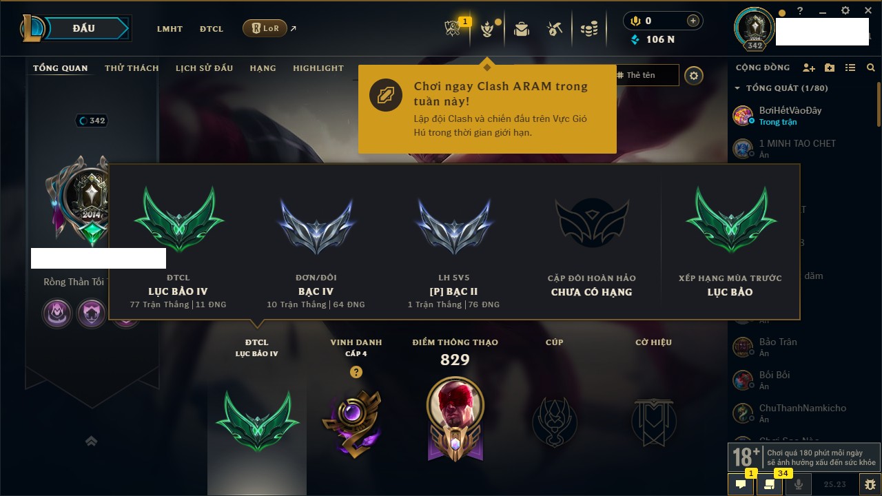 Rank Đơn: Vàng IIKhung: Bạch kimTướng: 172 - Còn 123420 THXTrang Phục: 231Rank ĐTCL: Bạch Kim IVLinh Thú: 213