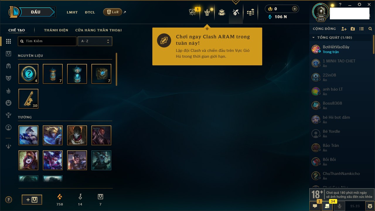 Rank Đơn: Bạch Kim IVKhung: VàngTướng: 170 - Còn 34137 THXTrang Phục: 209Rank ĐTCL: Chưa RankLinh Thú: 108