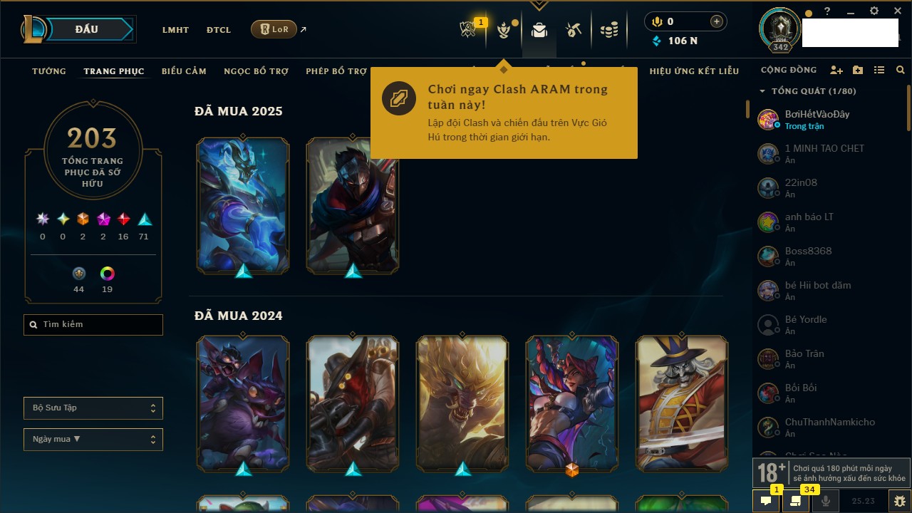 Rank Đơn: Vàng IIIKhung: VàngTướng: 172 - Còn 200315 THXTrang Phục: 87Rank ĐTCL: Chưa RankLinh Thú: 136