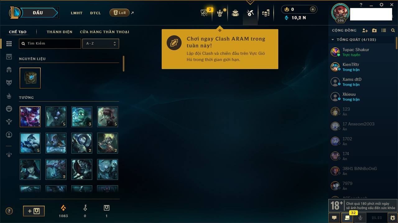 Rank Đơn: Vàng IVKhung: VàngTướng: 171 - Còn 660284 THXTrang Phục: 199Rank ĐTCL: Chưa RankLinh Thú: 34