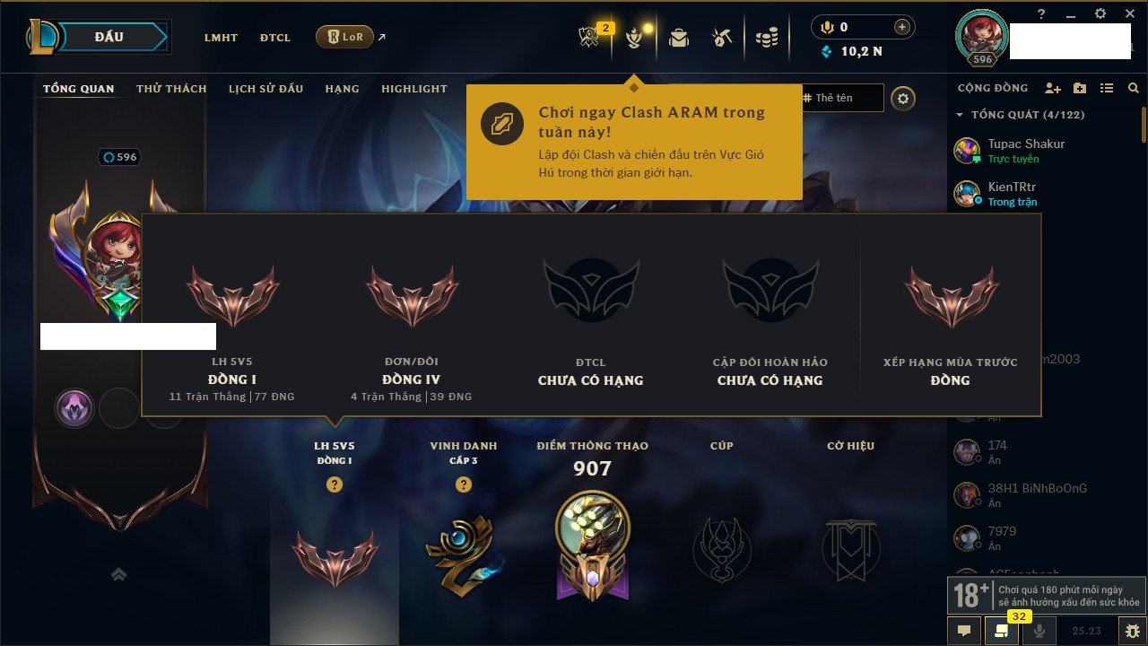 Rank Đơn: Vàng IKhung: BạcTướng: 171 - Còn 60584 THXTrang Phục: 286Rank ĐTCL: Vàng IIILinh Thú: 117