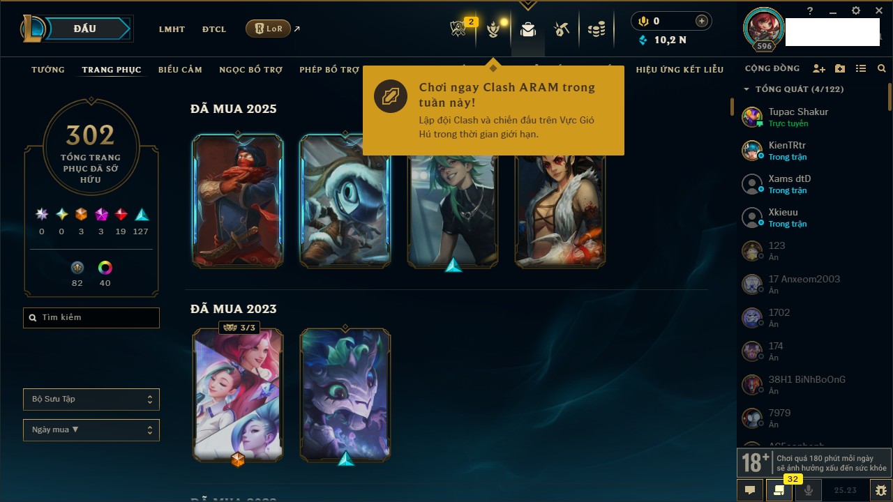 Rank Đơn: Vàng IIIKhung: VàngTướng: 171 - Còn 88128 THXTrang Phục: 329Rank ĐTCL: Chưa RankLinh Thú: 41