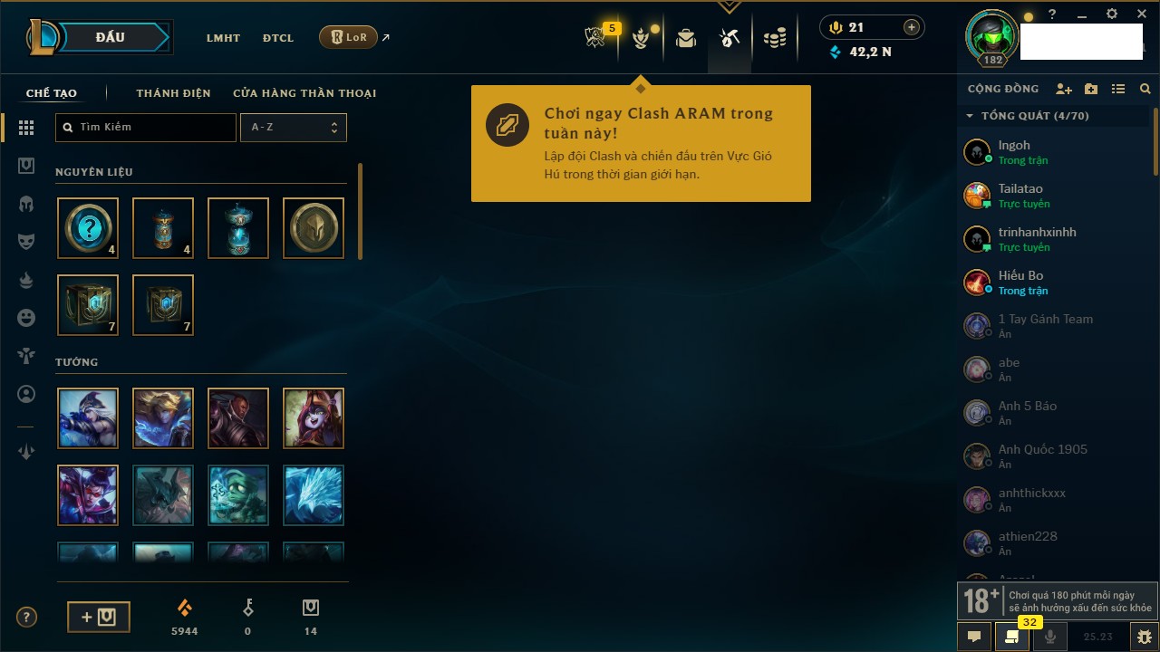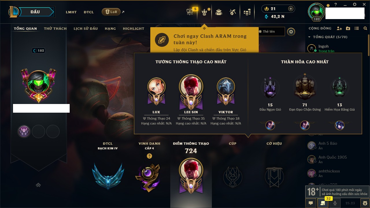 Rank Đơn: Bạch Kim IVKhung: VàngTướng: 171 - Còn 130578 THXTrang Phục: 253Rank ĐTCL: Chưa RankLinh Thú: 20
