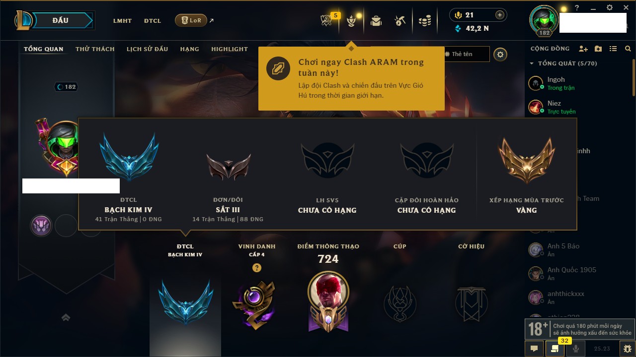 Rank Đơn: Bạch Kim IVKhung: VàngTướng: 171 - Còn 130280 THXTrang Phục: 226Rank ĐTCL: Kim Cương IVLinh Thú: 183