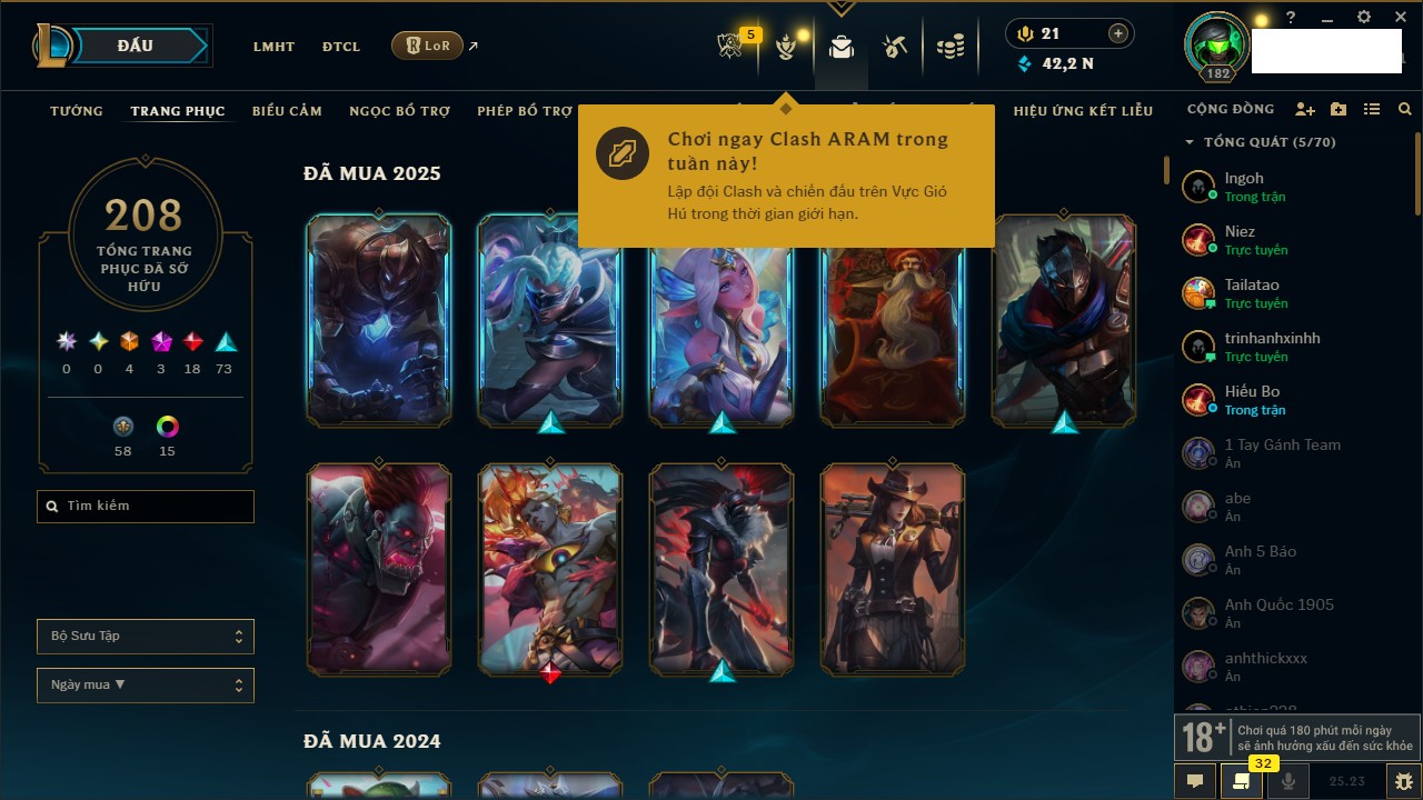 Rank Đơn: Vàng IIKhung: VàngTướng: 171 - Còn 219803 THXTrang Phục: 254Rank ĐTCL: Chưa RankLinh Thú: 78