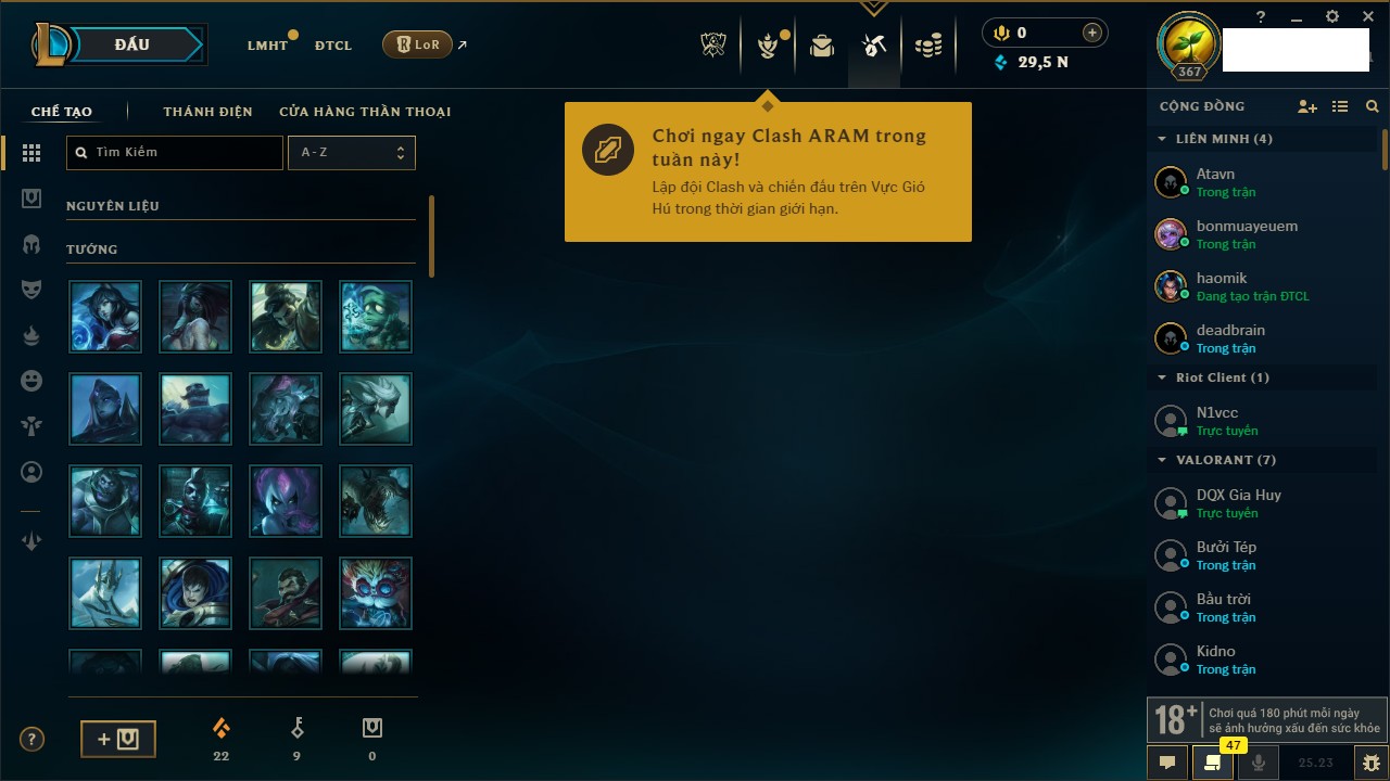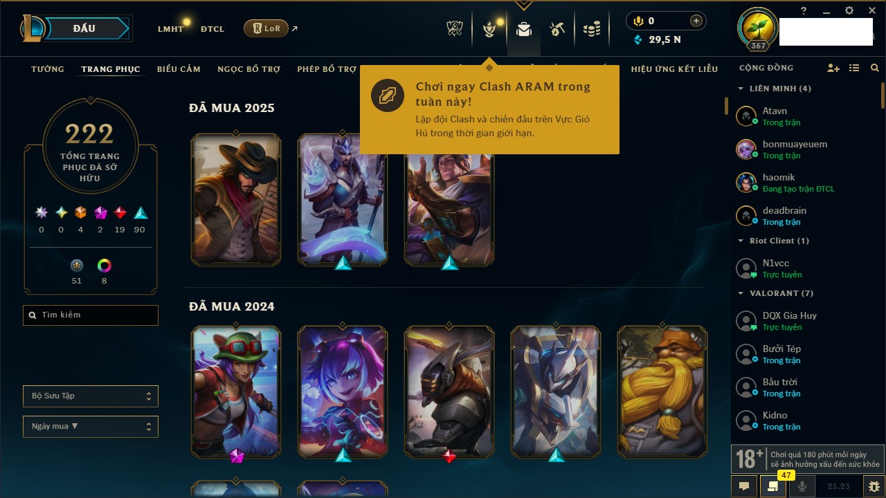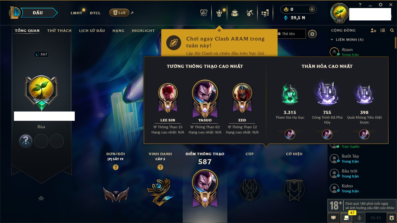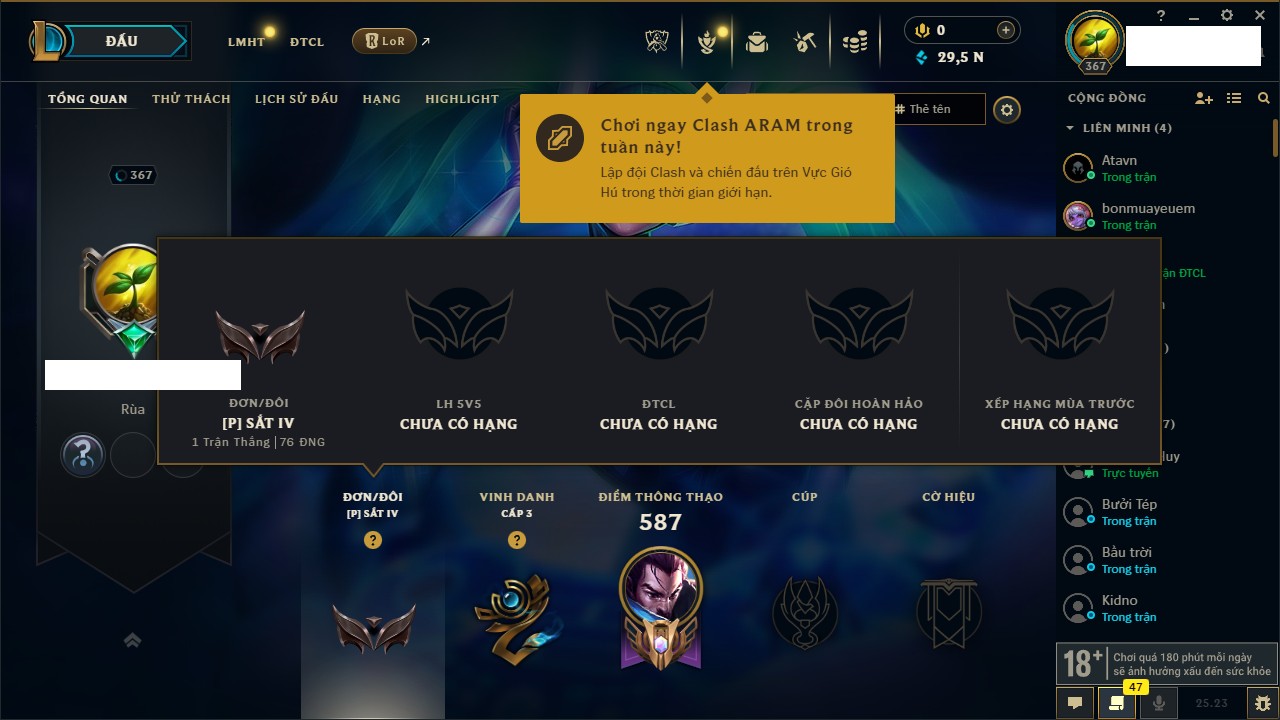 Rank Đơn: Vàng IKhung: Bạch kimTướng: 170 - Còn 212450 THXTrang Phục: 214Rank ĐTCL: Bạch Kim IVLinh Thú: 221