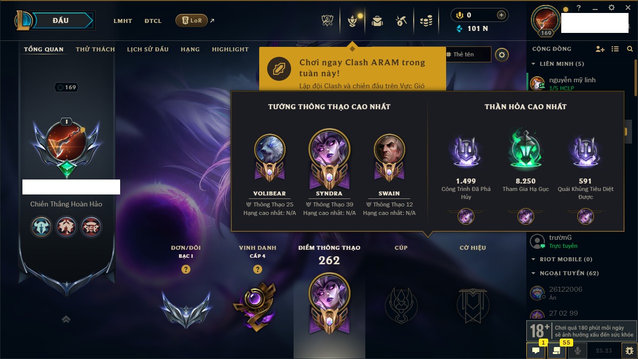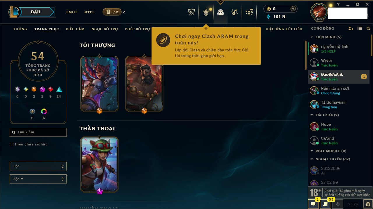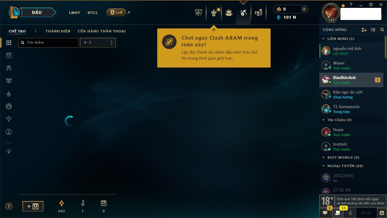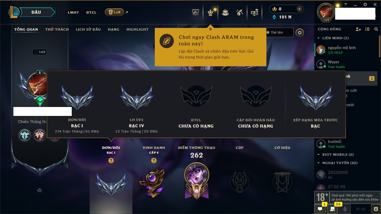 Rank Đơn: Bạc IIIKhung: BạcTướng: 171 - Còn 51045 THXTrang Phục: 220Rank ĐTCL: Sắt IILinh Thú: 141
