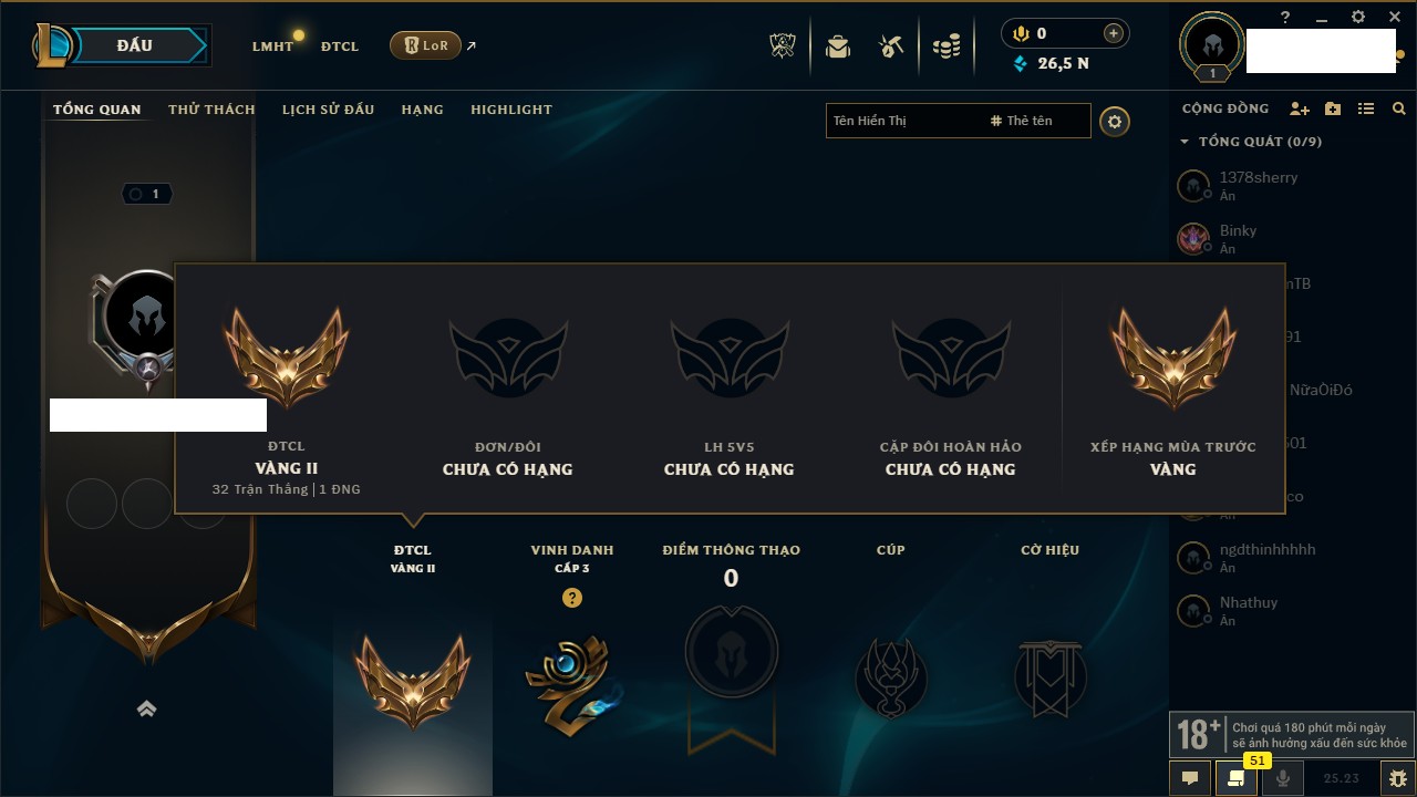 Rank Đơn: Sắt IIIKhung: SắtTướng: 171 - Còn 62070 THXTrang Phục: 198Rank ĐTCL: Bạch Kim IIILinh Thú: 237