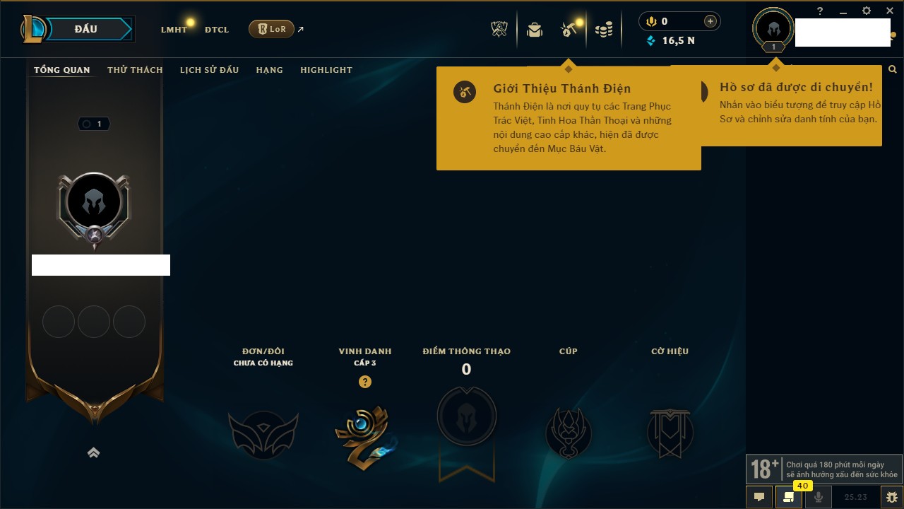 Rank Đơn: Chưa RankKhung: Lục BảoTướng: 167 - Còn 36594 THXTrang Phục: 247Rank ĐTCL: Chưa RankLinh Thú: 49
