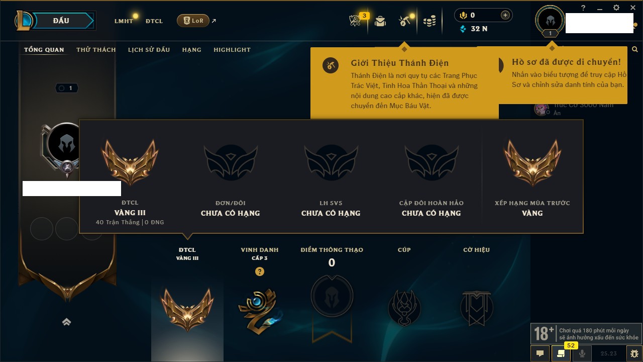 Rank Đơn: Chưa Rank Khung: Bạc Tướng: 84 - Còn 11948 THX Trang Phục: 23 Rank ĐTCL: Chưa Rank Linh Thú: 63