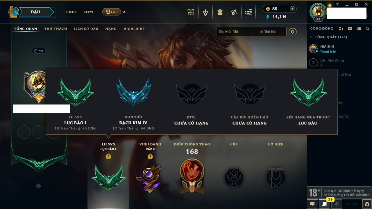 Rank Đơn: Đồng IIKhung: ĐồngTướng: 170 - Còn 66145 THXTrang Phục: 215Rank ĐTCL: Chưa RankLinh Thú: 52