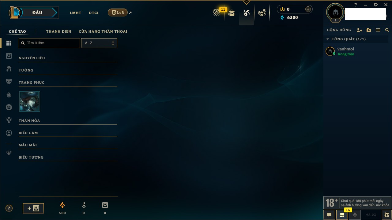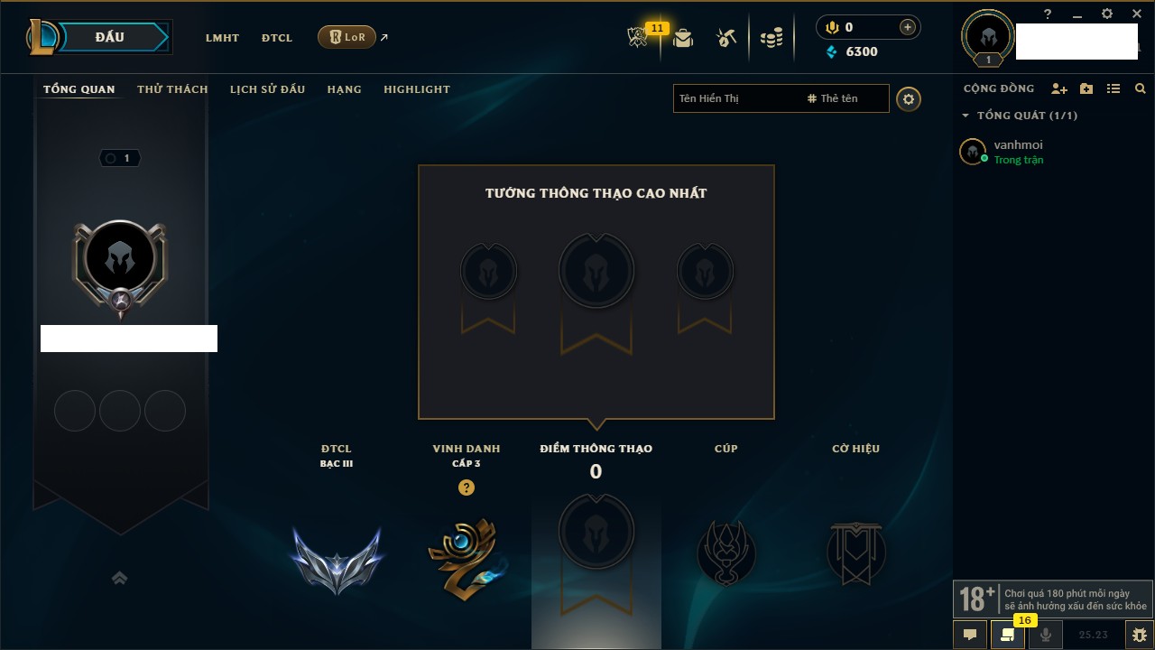 Rank Đơn: Chưa rank mùa nàoKhung: Chưa có khungTướng: 0 - Còn 6300 THXTrang Phục: 0Rank ĐTCL: Bạc IIILinh Thú: 3